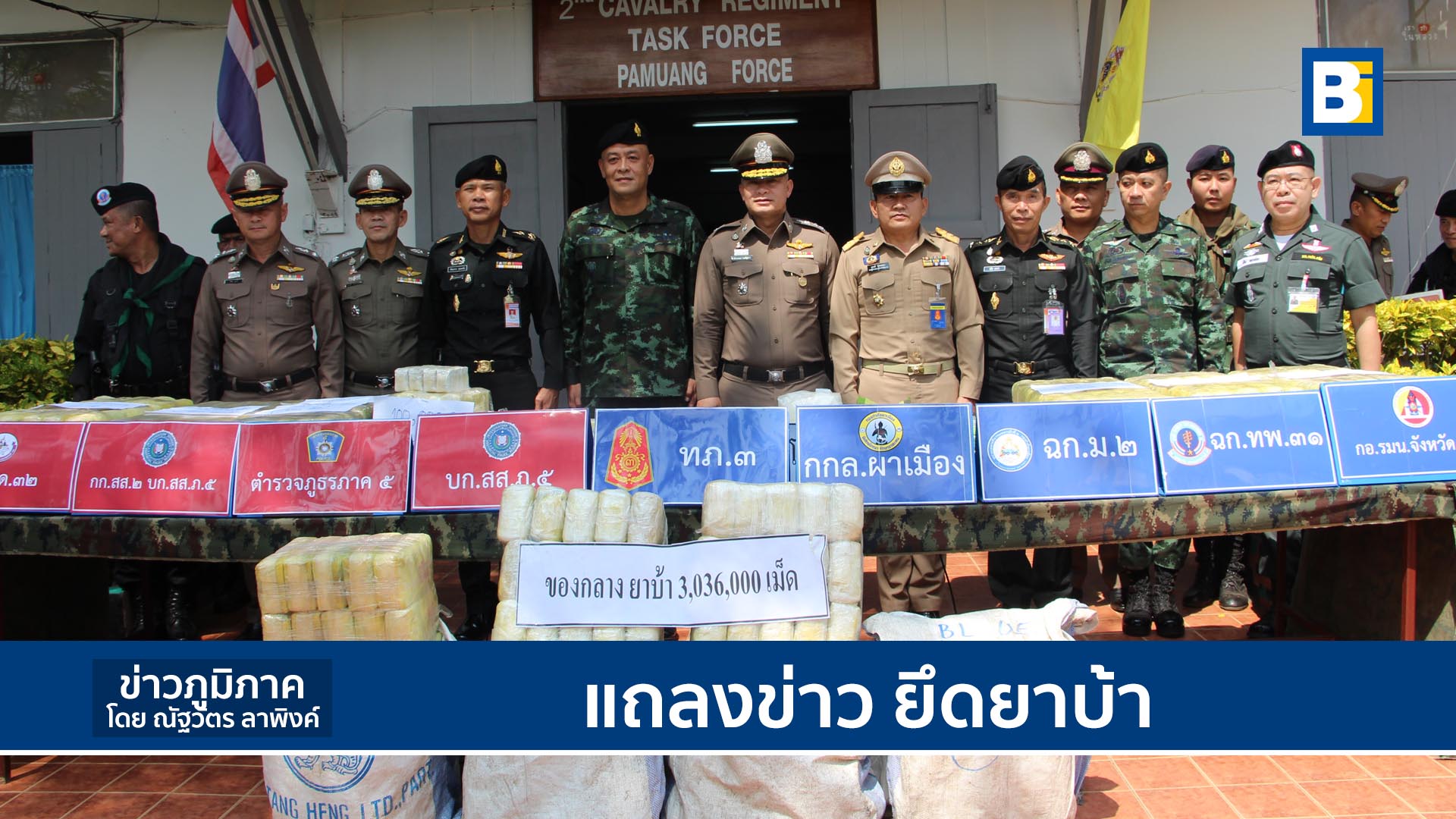 เวลา 11.00 น.วันที่ 6 ต.ค.62 ที่หน่วยเฉพาะกิจกองกำลังผาเมือง พล.ต.ท.ประจวบ วงค์สุข ผบช.ภ.5 พล.ต.ถนัดพล โกศัววี ผบ.กองกำลังผาเมือง พล.ต. วีรชน บุญทวี ผู้บังคับการกองบังคับการสืบสวนสอบสวนตำรวจภูธรภาค 5 พล.ต.ต. ยุทธชัย พัวประเสริฐ ผู้บังคับการตำรวจภูธรจังหวัดเชียงราย พ.อ.ชาตรี สงวนธรรม ผบ.ฉก.ม.2 กองกำลังผาเมือง พ.อ.สุทธิ์เขตต์ ศรีอินทิน ผบ.ฉก.31 ว่าที่ ร.ต.ณรงค์ โรจนสุทธร รอง ผู้ว่าราชการจังหวัดเชียงราย ได้ร่วมกันแถลงข่าว การตรวจยึดยาบ้าจำนวน 3,036,000 เม็ด และยาไอซ์ 40 กิโลกรัม พร้อม รถเก๋ง ยี่ห้อโตโยต้า รุ่นอัลติส สีบอร์นเงิน ทะเบียน ศฐ 8807 กทม.