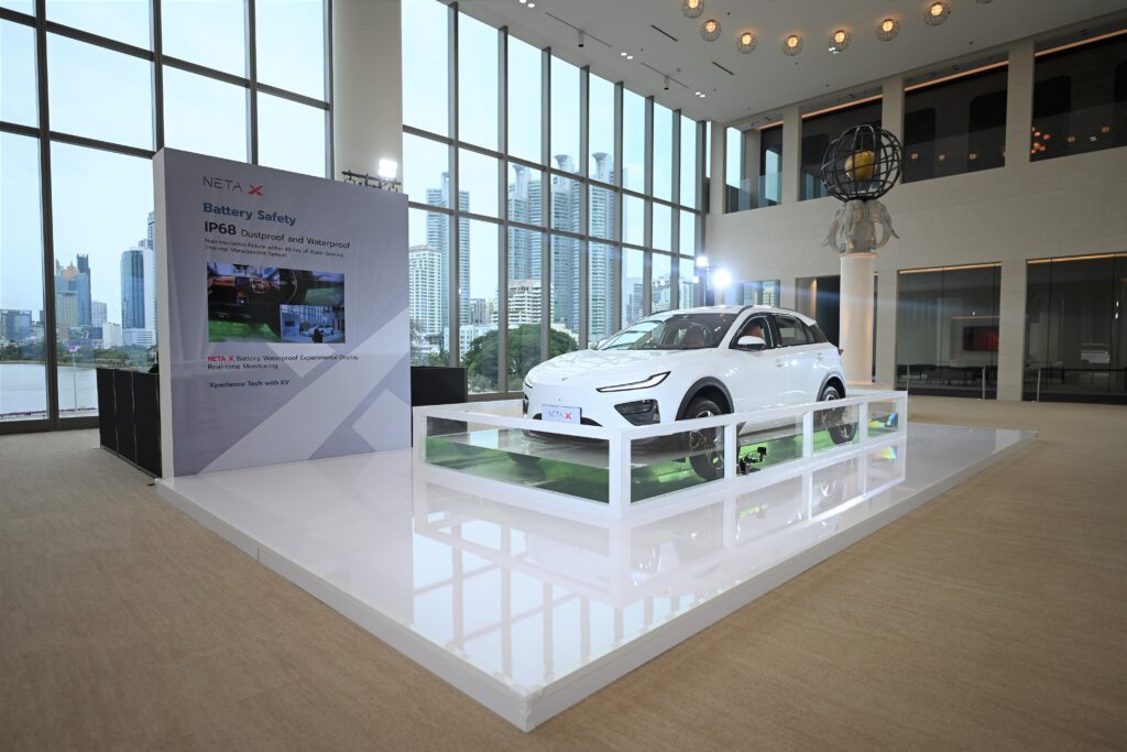 NETA X ใช้โครงสร้างที่ทำจากเหล็กแรงดึงสูง (High-strength Steel) ถึง 75% ของตัวถังมาพร้อมระบบถุงลมนิรภัย ถึง 6 จุด และแบตเตอรี่ที่ผ่านการทดสอบ IP68 ซึ่งเป็นระดับกันน้ำและกันฝุ่นระดับสูงสุดในตลาด โดยสามารถผ่านการทดสอบการกันน้ำอย่างต่อเนื่องยาวนานถึง 48 ชั่วโมง