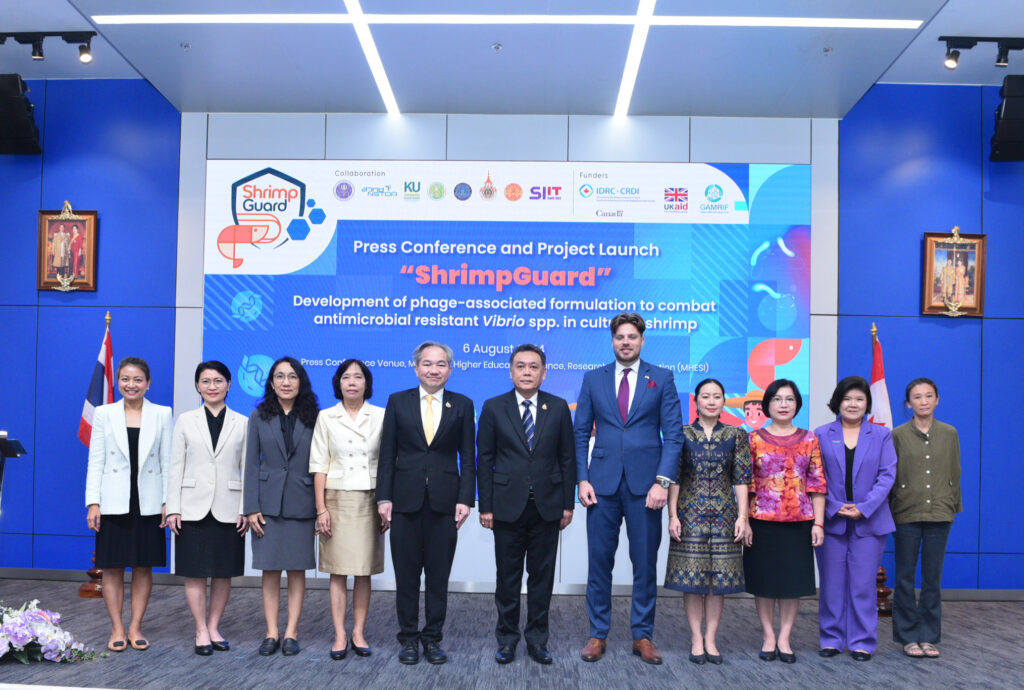 สำนักงานพัฒนาวิทยาศาสตร์และเทคโนโลยีแห่งชาติ (สวทช.) และมหาวิทยาลัยเกษตรศาสตร์ ร่วมกับทีมวิจัยจาก กรมประมง มหาวิทยาลัยเทคโนโลยีราชมงคลตะวันออก และ สถาบันเทคโนโลยีนานาชาติสิรินธร มหาวิทยาลัยธรรมศาสตร์ แถลงข่าวเปิดโครงการความร่วมมือ ‘ชริมป์การ์ด’ (ShrimpGuard): การพัฒนาสูตรผสมของแบคทีริโอฟาจ (bacteriophage) หรือฟาจ (phage) และสารเสริมชีวนะเพื่อต่อสู้กับเชื้อแบคทีเรีย Vibrio spp. ที่ดื้อต่อยาปฏิชีวนะในกุ้งเลี้ยง’