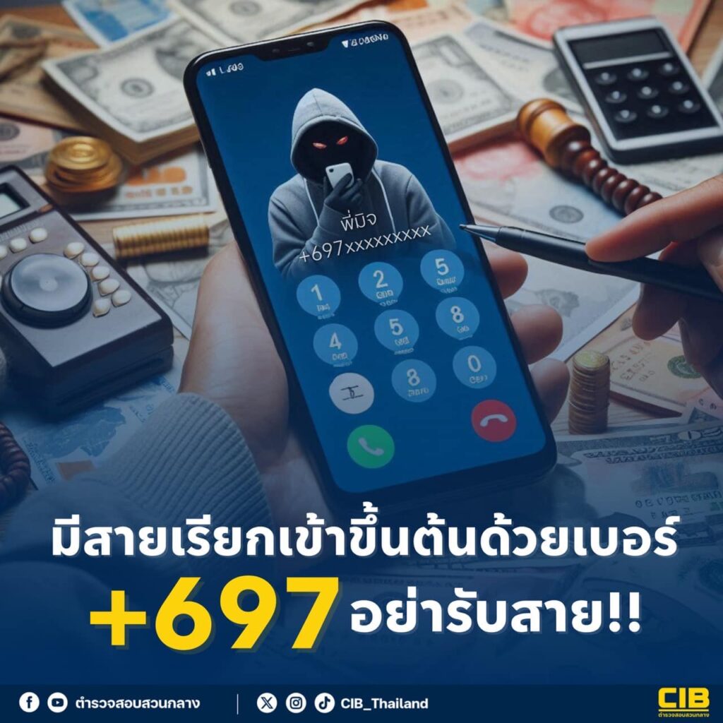 “มีสายเรียกเข้าขึ้นต้นด้วยเบอร์นี้อย่ารับสาย หากได้รับสายจากเบอร์ที่ขึ้นต้นด้วย +697 หรือ +698 เเละ +66 นั่นคือสายจากมิจฉาชีพที่ใช้ระบบ VoIP โทรเข้ามาจากต่างประเทศ ซึ่ง กสทช. ได้กำหนดให้โอเปอร์เรเตอร์ (Operatore) แปะรหัสนี้ไว้เพื่อให้ผู้รับสายระวังตัวรู้ว่าคือเบอร์โทรจากมิจฉาชีพ ตำรวจสอบสวนกลาง(CIB) ขอแนะนำว่าหากมีเบอร์ ขึ้นต้นด้วย +697 หรือ +698 เเละ +66 โดยไม่มีธุระติดต่อจากต่างประเทศ ให้วางสายทันที อย่ารับสายหรือโต้ตอบ เพราะอาจถูกหลอกลวงหรือขโมยข้อมูลส่วนตัว ทั้งนี้ สามารถแจ้งเบาะแสหรือข้อมูลเกี่ยวกับมิจฉาชีพในลักษณะดังกล่าว ได้ที่สายด่วนศูนย์ AOC 1441 ตลอด 24 ชั่วโมงครับ”