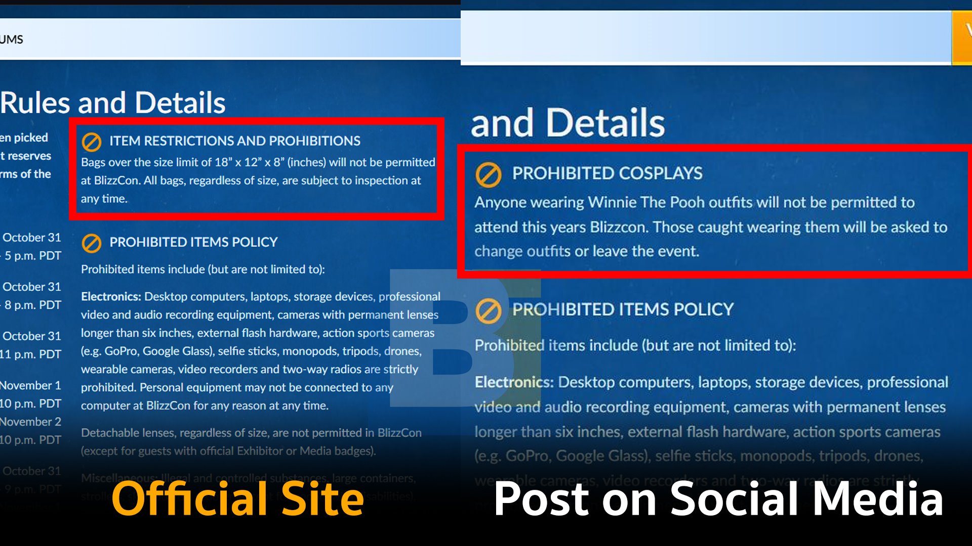 ปกติแล้วก็จะมีข้อห้ามต่างๆเป็นปกติอยู่แล้ว และมีการคอสเพลย์จากเกมดังของค่ายอย่าง Overwatch และ Starcraft แต่จากการตรวจสอบพบว่าข้อความดังกล่าวเริ่มปรากฏในสื่อสังคมออนไลน์ เมื่อวานนี้(9 ต.ค.)ทั้งใน เฟซบุ๊กและทวิตเตอร์