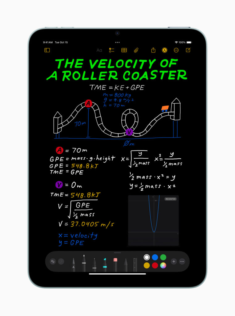 - แอปเครื่องคิดเลข ซึ่งออกแบบมาเพื่อความสามารถที่ไม่เหมือนใครของ iPad ช่วยให้ผู้ใช้มีวิธีใหม่ในการใช้ Apple Pencil เพื่อแก้นิพจน์หรือสมการทางคณิตศาสตร์อย่างที่ไม่เคยทำได้มาก่อน รวมถึงเครื่องคิดเลขพื้นฐานและเครื่องคิดเลขทางวิทยาศาสตร์ พร้อมด้วยฟังก์ชั่นใหม่อย่างประวัติการคำนวณและการแปลงหน่วย นอกจากนี้ยังมี Math Notes หรือโน้ตคณิตศาสตร์ ซึ่งให้ผู้ใช้พิมพ์หรือเขียนนิพจน์ทางคณิตศาสตร์ แล้วดูคำตอบที่จะแสดงในลายมือของตัวเองทันที หรือจะกำหนดและใช้ค่าตัวแปร แล้วเขียนสมการเพื่อใส่กราฟก็ได้ อีกทั้งยังสามารถเข้าถึงโน้ตคณิตศาสตร์จากในแอปโน้ต และใช้ฟังก์ชั่นทางคณิตศาสตร์ทั้งหมดในโน้ตใดก็ได้