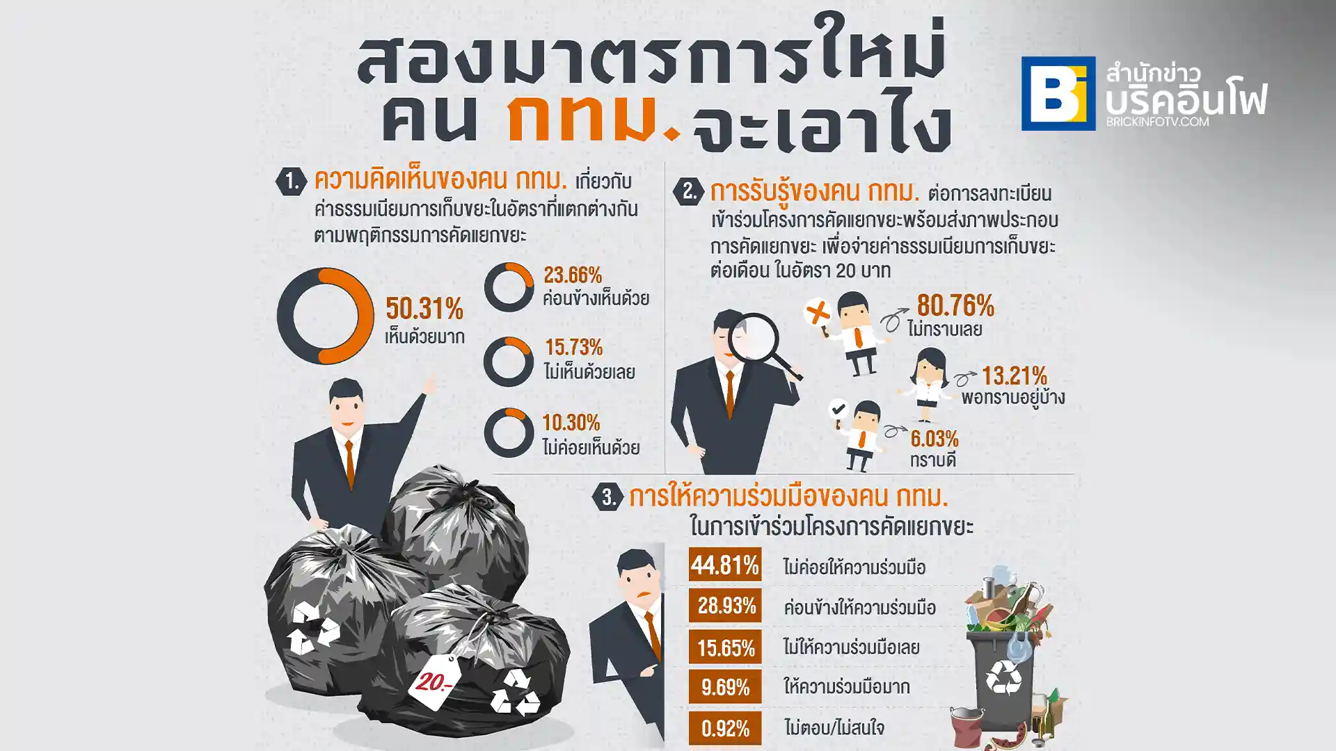 นิด้าโพล สำรวจความคิดเห็นของประชาชนในกรุงเทพฯ จำนวน 1,310 หน่วยตัวอย่าง ระหว่างวันที่ 27-29 พฤศจิกายน 2567 พบว่า ร้อยละ 50.31 เห็นด้วยมากกับการจัดเก็บค่าธรรมเนียมขยะตามพฤติกรรมการคัดแยก รองลงมา ร้อยละ 23.66 ค่อนข้างเห็นด้วย ขณะที่ร้อยละ 15.73 ไม่เห็นด้วย และร้อยละ 10.30 ไม่ค่อยเห็นด้วย อย่างไรก็ตาม คนกรุงเทพฯ ส่วนใหญ่ยังไม่ทราบถึงโครงการลงทะเบียนคัดแยกขยะเพื่อจ่ายค่าธรรมเนียมในอัตรา 20 บาท โดยร้อยละ 80.76 ระบุว่าไม่ทราบเลย