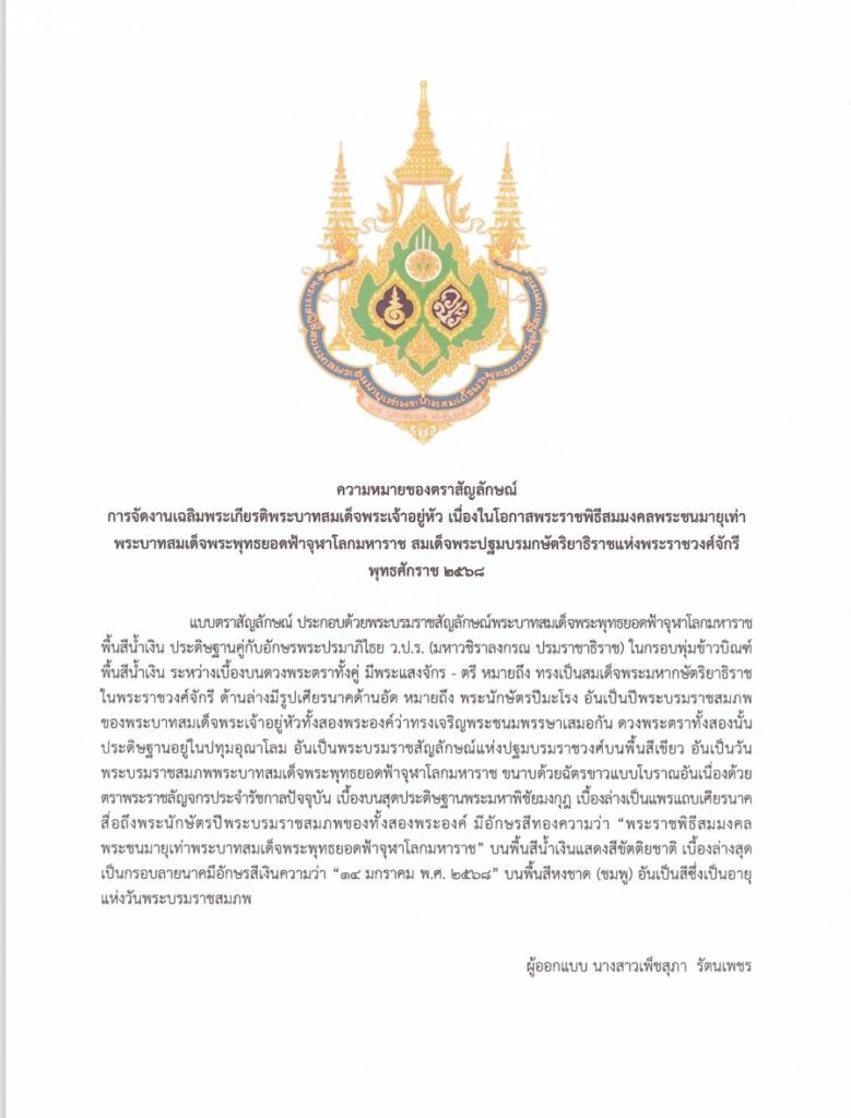 สำนักนายกรัฐมนตรี เผยแพร่ความหมายตราสัญลักษณ์ งานเฉลิมพระเกียรติพระบาทสมเด็จพระเจ้าอยู่หัว เนื่องในโอกาสพระราชพิธีสมมงคลพระชนมายุเท่า พระบาทสมเด็จพระพุทธยอดฟ้าจุฬาโลกมหาราช 14 มกราคม 2568