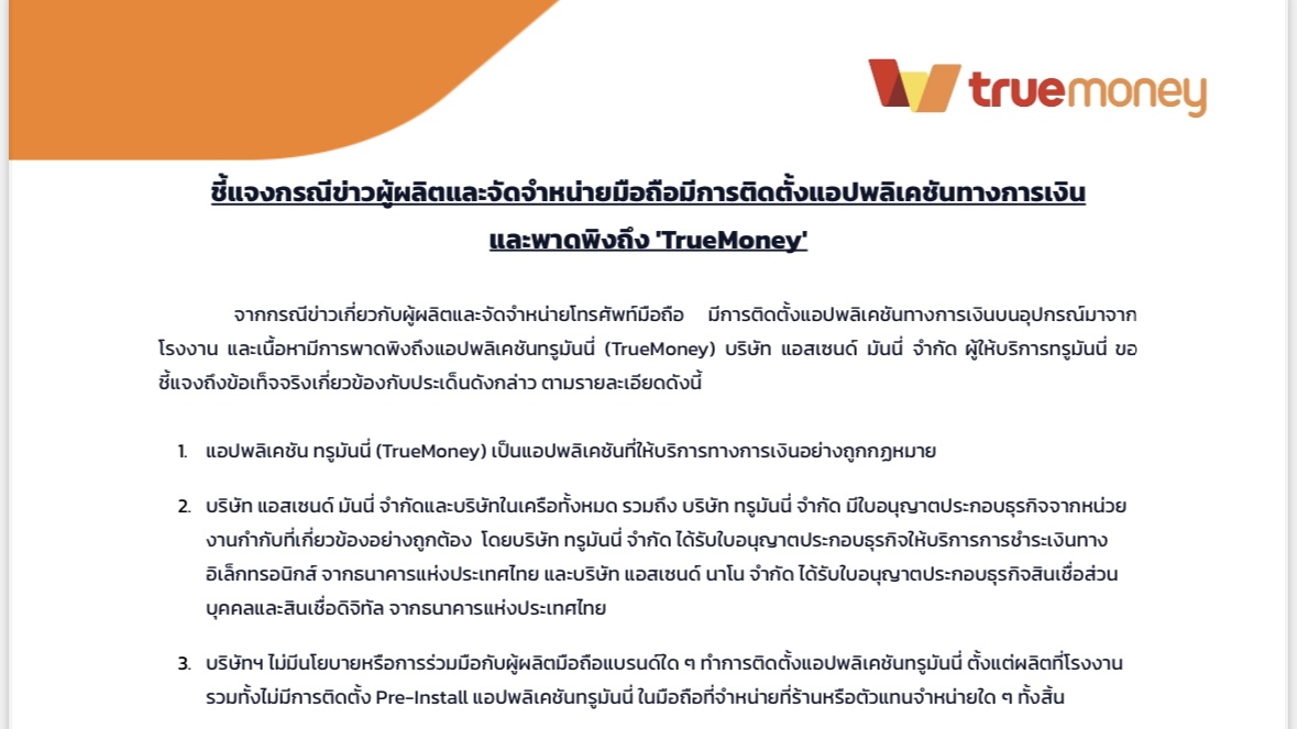 ล่าสุด บริษัท แอสเซนด์ มันนี่ จำกัด ผู้ให้บริการ TrueMoney ได้ออกมาชี้แจงข้อเท็จจริงว่า บริษัทฯ ไม่มีนโยบายหรือการร่วมมือกับผู้ผลิตมือถือแบรนด์ใด ๆ ในการติดตั้งแอปฯ TrueMoney ลงในเครื่องตั้งแต่โรงงาน รวมถึงไม่มีการติดตั้งแอปฯ TrueMoney ไว้ล่วงหน้าในมือถือที่จำหน่ายที่ร้านหรือตัวแทนจำหน่ายใด ๆ ทั้งสิ้น