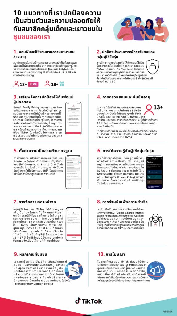 นอกจากนี้ TikTok ยังเพิ่มฟีเจอร์ “ควบคุมโดยผู้ปกครอง” (Family Pairing) ที่ช่วยให้ผู้ปกครองสามารถทราบได้ว่าบุตรหลานที่อยู่ภายใต้การดูแลนั้นกำลังติดตามใครอยู่บ้าง เพื่อนคนไหนที่ติดตามบุตรหลาน และเนื้อหาที่บุตรหลานสนใจบน TikTok คืออะไร ซึ่งช่วยให้เกิดบทสนทนาที่เปิดกว้างและกระตุ้นให้เยาวชนสามารถพัฒนาความรู้และทักษะดิจิทัลที่สำคัญได้