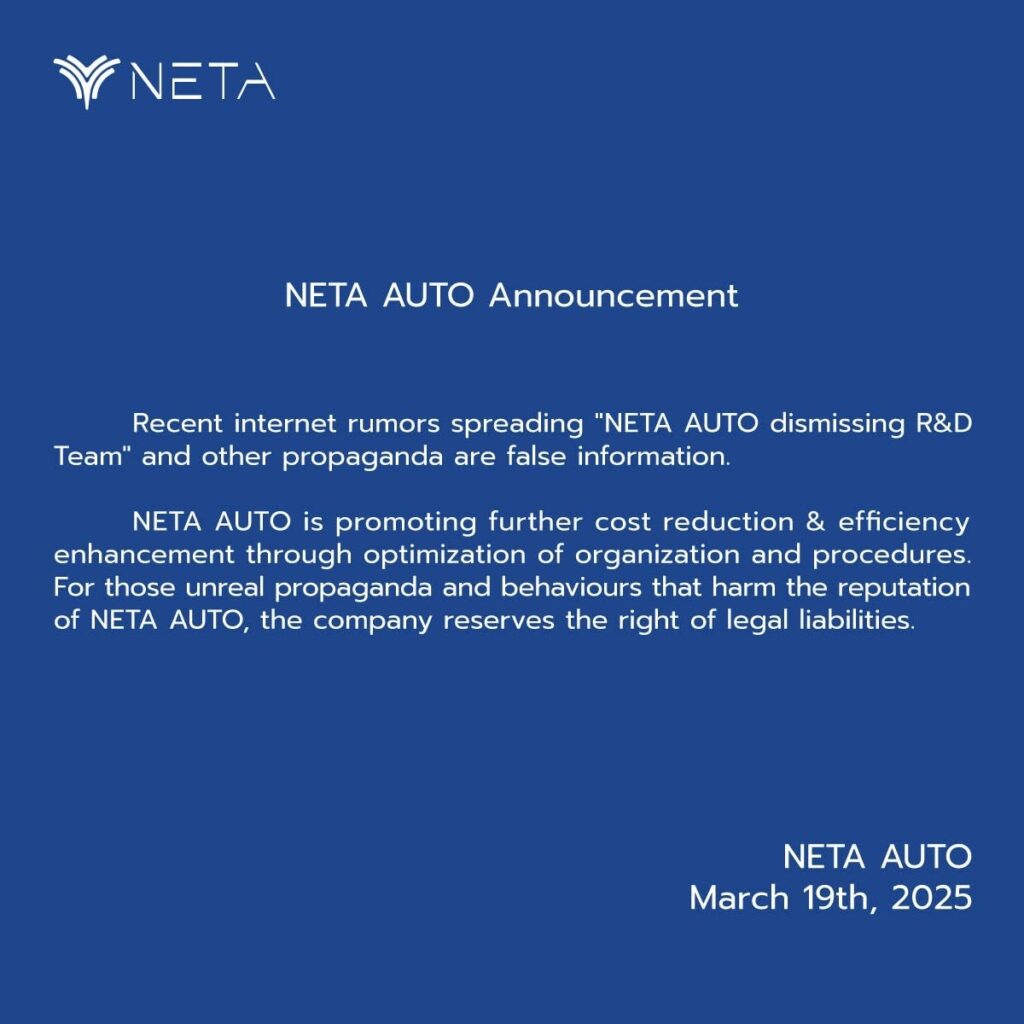 ขณะที่ชี้แจงจากสำนักงานใหญ่ของ NETA ในไทย เกี่ยวกับข่าวลือในโลกออนไลน์ “ขณะนี้บริษัทฯ กำลังดำเนินการปรับโครงสร้างองค์กร และปฏิรูปภายในอย่างต่อเนื่อง เพื่อเสริมสร้างประสิทธิภาพการดำเนินงานและมุ่งเน้นที่ธุรกิจหลักอย่างเต็มที่ ด้วยเป้าหมายในการเพิ่มความสามารถในการแข่งขันและเสริมความแข็งแกร่งเพื่อการเติบโตที่ยั่งยืนในอนาคต ประเทศไทยถือเป็นตลาดสำคัญของ NETA AUTO โดยมีฐานผู้ใช้จำนวนมาก และได้รับความนิยมจากผู้บริโภคชาวไทยเป็นอย่างดี NETA ยังคงให้ความสำคัญกับการพัฒนาที่ยั่งยืนในประเทศไทย พร้อมมุ่งมั่นที่จะนำเสนอผลิตภัณฑ์และเทคโนโลยีที่ดีที่สุดให้แก่ผู้บริโภคชาวไทยต่อไป เราขอขอบคุณผู้บริโภคและสื่อมวลชนทุกท่านที่ให้ความไว้วางใจ และการสนับสนุนที่ดีต่อแบรนด์ NETA ในประเทศไทยด้วยดีเสมอมา บริษัทฯ ขอยืนยันว่าเราจะยังคงดำเนินธุรกิจ โดยมุ่งมั่นพัฒนาผลิตภัณฑ์และเทคโนโลยีที่สามารถเป็นเจ้าของได้สำหรับคนไทย ซึ่งสอดคล้องกับพันธกิจหลักของ NETA ในการสร้างการเข้าถึงเทคโนโลยีอย่างเท่าเทียมกันสำหรับทุกคน “TECH FOR ALL””