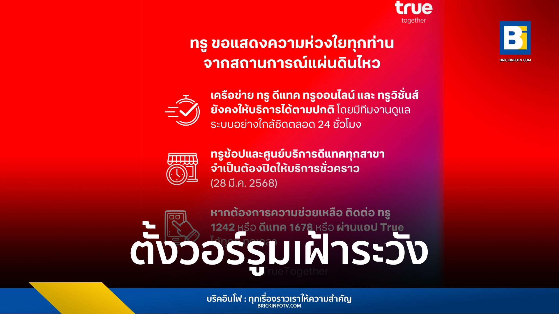 ทรู คอร์ปอเรชั่น ขอส่งความห่วงใยถึงลูกค้าทรูและดีแทคทุกท่านจากเหตุการณ์แผ่นดินไหวที่เกิดขึ้นในประเทศไทย ทั้งนี้ โครงข่ายโทรคมนาคมของทรูยังคงให้บริการได้ตามปกติทุกระบบ ทั้งโทรศัพท์เคลื่อนที่ อินเทอร์เน็ตบ้าน เคเบิ้ลทีวี และบริการดิจิทัล และเพื่อให้ลูกค้าทุกท่านสามารถติดต่อสื่อสารได้อย่างมั่นใจในช่วงสถานการณ์ฉุกเฉิน ทรู ได้จัดตั้ง “วอร์รูมเฝ้าระวังภัยพิบัติ” โดยมีทีมวิศวกรและทีมดูแลโครงข่ายประจำการตลอด 24 ชั่วโมงที่ BNIC เพื่อติดตามและตรวจสอบสถานะของเครือข่ายในพื้นที่ต่างๆ อย่างใกล้ชิด พร้อมเตรียมความพร้อมรับมือกรณีหากมีเหตุการณ์ After shock หลังจากนี้
