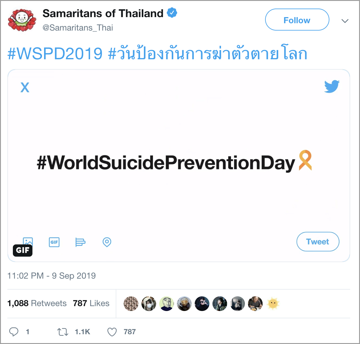 จากความร่วมมือนี้ ทวิตเตอร์ยังได้มอบ #AdsForGood ให้กับสมาคมสะมาริตันส์แห่งประเทศไทย (@Samaritans_Thai) เพื่อช่วยให้ข้อความเหล่านี้เข้าถึงกลุ่มคนที่มีปัญหาได้มากขึ้น