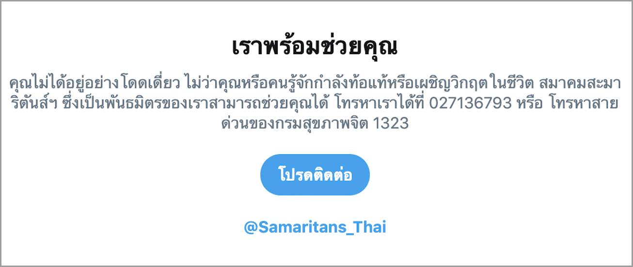 เมื่อมีการค้นหาคำที่เกี่ยวข้องกับคำว่า “ฆ่าตัวตาย” หรือ “ทำร้ายตนเอง” บนทวิตเตอร์ในประเทศไทย โดยจะมีการแจ้งเตือนเป็น ภาษาไทยปรากฎในผลการค้นหาเพื่อเป็นการทำให้กลุ่มผู้มีความเสี่ยงกล้าขอความช่วยเหลือ โดยในการแจ้งเตือนจะมีเบอร์ติดต่อ ของสมาคมสะมาริตันส์แห่งประเทศไทย (@Samaritans_Thai) และเบอร์ติดต่อสายด่วนของกรมสุขภาพจิต (@PR_dmh)