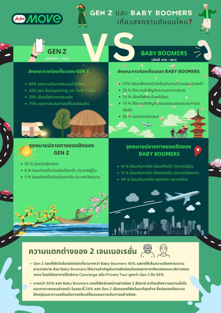 สำนักข่าวบริคอินโฟ – แพลตฟอร์มการจองที่พักและเที่ยวบินชั้นนำอย่าง AirAsia MOVE ได้เปิดเผยข้อมูลเชิงลึกเกี่ยวกับพฤติกรรมการท่องเที่ยวในช่วงเทศกาลสงกรานต์ของสองกลุ่มเจเนอเรชันหลัก ได้แก่ Gen Z (ผู้ที่เกิดระหว่างปี 1997-2012) และ Baby Boomers (ผู้ที่เกิดระหว่างปี 1946-1964) พบว่าทั้งสองกลุ่มมีแนวโน้มและความต้องการในการเดินทางที่แตกต่างกันอย่างชัดเจน ทั้งในด้านวิธีการจอง ที่พัก จุดหมายปลายทาง และรูปแบบการท่องเที่ยว