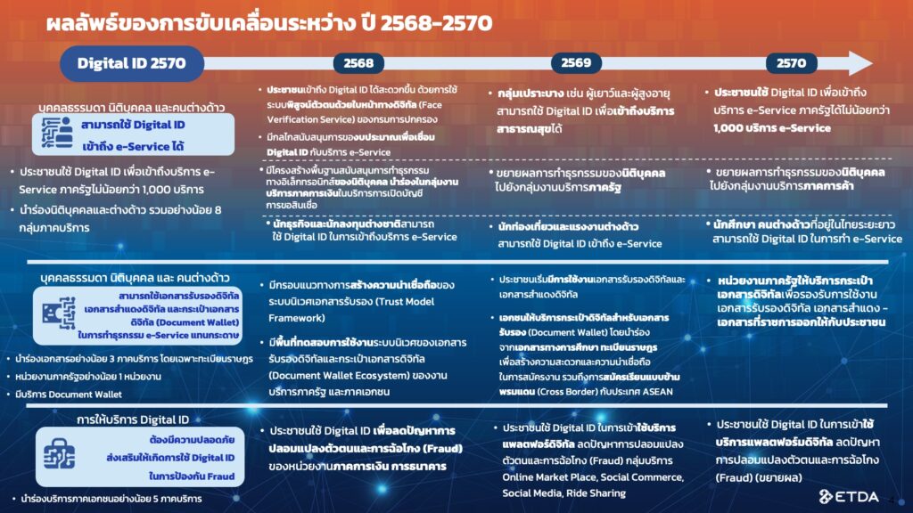 ภายในปี 2570 คาดว่าประชาชน นิติบุคคล และคนต่างด้าว จะสามารถใช้ Digital ID เพื่อเข้าถึงบริการ e-Service ได้อย่างทั่วถึง โดยประชาชนจะเข้าถึงบริการภาครัฐไม่ต่ำกว่า 1,000 รายการ นอกจากนี้ยังมีการส่งเสริมให้ใช้ เอกสารรับรองดิจิทัล เอกสารสำแดงดิจิทัล และ กระเป๋าเอกสารดิจิทัล (Document Wallet) แทนเอกสารกระดาษในการทำธุรกรรม โดยมีเป้าหมายที่ชัดเจนในแต่ละปี เช่น ปี 2568 เน้นการวางรากฐานทางเทคนิคและนโยบาย อาทิ การใช้ Face Verification Service ของกรมการปกครอง และการสนับสนุนการทำธุรกรรมของนิติบุคคลและนักลงทุนต่างชาติ ปี 2569 จะขยายการเข้าถึงไปยังกลุ่มเปราะบาง และเริ่มใช้งานในบริบทที่หลากหลายขึ้น รวมถึงการใช้ Document Wallet ในเอกสารทางการศึกษาและทะเบียนราษฎร ส่วนในปี 2570 จะบรรลุเป้าหมายสำคัญในการขยายผลการใช้งาน Digital ID ในบริการ e-Service ภาครัฐกว่า 1,000 บริการ และภาคการค้าสำหรับนิติบุคคล รวมถึงการใช้งานแพลตฟอร์มดิจิทัลเพื่อลดปัญหาการปลอมแปลงตัวตน