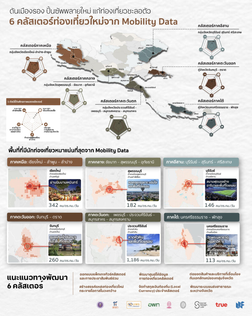 จากการวิเคราะห์ Mobility Data ในประเทศไทย สามารถแบ่งได้เป็น 25 กลุ่มจังหวัดที่มีศักยภาพในการสร้างมูลค่าทางเศรษฐกิจผ่าน อุตสาหกรรมท่องเที่ยว ได้อย่างมาก เช่น กลุ่มเชียงใหม่-ลำปาง-ลำพูน หรือกลุ่มสุพรรณบุรี-ชัยนาท-อุทัยธานี ซึ่งการเก็บข้อมูลด้วยวิธีสำรวจแบบเดิมเป็นความท้าทายอย่างมาก แต่ด้วยเทคโนโลยีดิจิทัลและ Mobility Data ทำให้สามารถวิเคราะห์ได้ว่าประเทศไทยควรส่งเสริมจุดใดเป็นพิเศษในแต่ละคลัสเตอร์ เช่น กลุ่มเชียงใหม่-ลำปาง-ลำพูน นักท่องเที่ยวที่มาเยือน 3 จังหวัดนี้มักจะชมเมืองเก่าวิถีล้านนา ซึ่งสามารถนำมาสร้างอัตลักษณ์ประจำท้องถิ่นและกำหนดเส้นทางการเดินทางได้