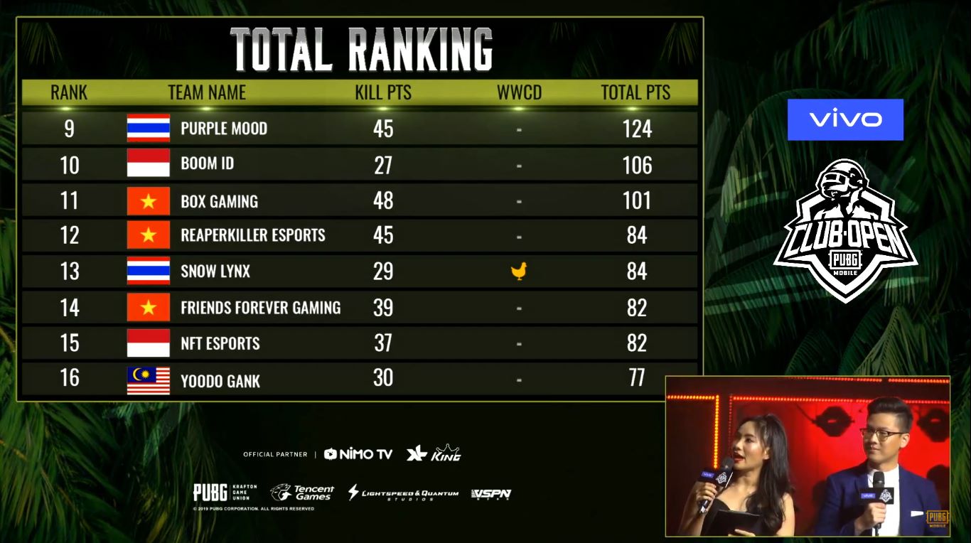 บริษัท เทนเซ็นต์ (ประเทศไทย) จำกัด ผู้ให้บริการเกม PUBG MOBILE ในประเทศไทย รายงานผลการแข่งขันและขอแสดงความยินดีกับทีม RRQ Athena ทีมไทยที่โชว์ผลงานสุดประทับใจแฟน ๆ ตลอด 2 วัน ผงาดคว้าแชมป์ในรอบ SEA Finals ด้วยการเบียดเอาชนะทีม Illuminate The Murder อีกหนึ่งตัวแทนจากประเทศไทย ไปด้วยสกอร์ 211 คะแนน ต่อ 188 คะแนน ในทัวร์นาเมนต์ลีกระดับโลก “PUBG MOBILE Club Open SEA 2019 Title Sponsored by VIVO” หรือ PMCO SEA 2019 ฤดูกาล Fall split ซึ่งจัดโดย VSPN ผู้สนับสนุนหลักโดย VIVO ที่มอบอุปกรณ์หลักในการแข่งขันครั้งนี้คือสมาร์ทโฟน VIVO รุ่น V17 Pro และการสนับสนุนการถ่ายทอดสดผ่าน NIMO TV และ XL KingCard พร้อมรับเงินรางวัลราว 1.1 ล้านบาท โดยทั้งสองทีมนี้ยังได้สิทธิ์ผ่านเข้ารอบไปแข่งขันเพื่อลุ้นแชมป์ต่อแบบอัตโนมัติในรอบ Global Finals ที่จะจัดขึ้นระหว่างวันที่ 29 พฤศจิกายน – 1 ธันวาคม ศกนี้ ณ ประเทศมาเลเซีย