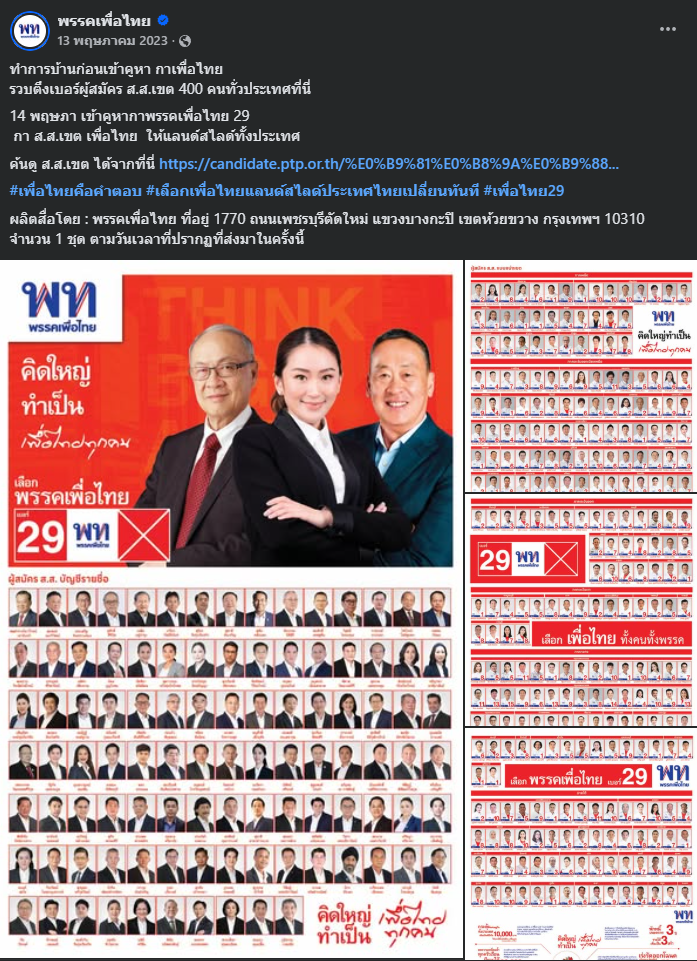 นอกจากนี้ เมื่อวันที่ 13 พฤษภาคม 2566 หรือหนึ่งวันก่อนการเลือกตั้งใหญ่ เพจเฟซบุ๊กพรรคเพื่อไทย ได้เคยโพสต์ภาพผู้สมัคร สส. เขต 400 คนทั่วประเทศ พร้อมข้อความเชิญชวนให้ประชาชน “ทำการบ้านก่อนเข้าคูหา กาเพื่อไทยรวบตึงเบอร์ผู้สมัคร ส.ส.เขต 400 คนทั่วประเทศ” ด้วย
