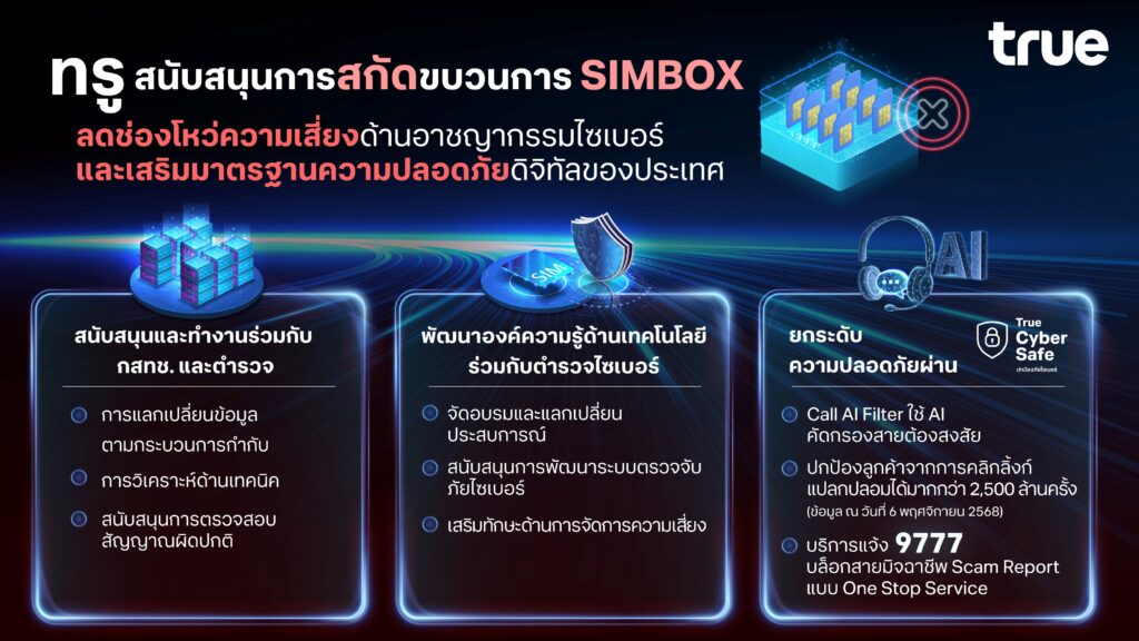 ในการสกัดกั้นกลโกงของมิจฉาชีพที่ซับซ้อนและเปลี่ยนแปลงรูปแบบอยู่ตลอดเวลา ทรู คอร์ปอเรชั่น ได้มีการยกระดับความปลอดภัยผ่าน True CyberSafe ซึ่งเป็นเกราะป้องกันภัยดิจิทัลสำหรับลูกค้า โดยมีการให้บริการ Call AI Filter ที่ใช้ปัญญาประดิษฐ์ (AI) ในการคัดกรองสายต้องสงสัย รวมถึงช่วยปกป้องลูกค้าจากการคลิกลิ้งก์แปลกปลอมไปแล้วกว่า 2,531 ล้านครั้ง (ข้อมูล ณ วันที่ 6 พฤศจิกายน 2568) และยังมีบริการแจ้ง 9777 บล็อกสายมิจฉาชีพ Scam Report แบบ One Stop Service ให้ประชาชนแจ้งบล็อกสายต้องสงสัยและส่งต่อข้อมูลให้เจ้าหน้าที่ตำรวจได้อย่างรวดเร็ว