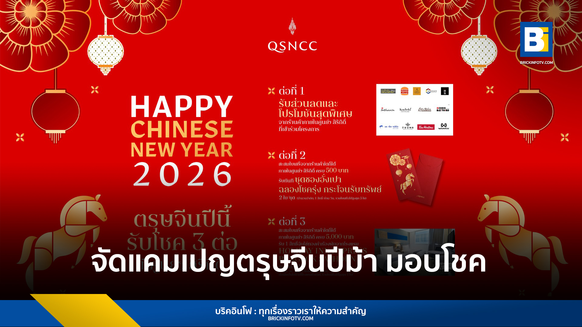ศูนย์การประชุมแห่งชาติสิริกิติ์ เตรียมจัดกิจกรรมต้อนรับเทศกาลตรุษจีนปีม้า 2569 ภายใต้แคมเปญ ฉลองโชครุ่ง กระโจนรับทรัพย์กับปีม้า เพื่อกระตุ้นการใช้จ่ายและสร้างสีสันให้กับผู้ใช้บริการ โดยมอบสิทธิพิเศษครอบคลุมทั้งส่วนลดจากร้านค้า ชุดซองอั่งเปามงคล และรางวัลใหญ่เป็นที่พักโรงแรมชั้นนำใจกลางเมือง ตลอดระยะเวลา 5 วันเต็ม ตั้งแต่วันที่ 16–20 กุมภาพันธ์ 2569 ณ บริเวณชั้น LG