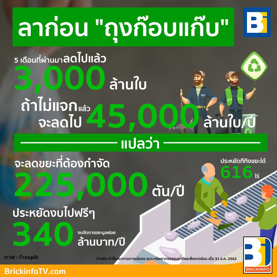 สำนักข่าว BBC อ้างอิง คำชี้แจง/คาดการณ์ของ รมว.ทรัพยากรธรรมชาติและสิ่งแวดล้อม เมื่อ 31 ธ.ค. 2562 ว่า ไทยสามารถลดถุงพลาสติกได้หลังรณรงค์จริงจังในช่วง 5 เดือนก่อน ได้ถึง 3,000 ล้านใบ และจะสามารถลดถุงพลาสติกหูหิ้วหรือถุงก๊อบแก๊บ 45,000 ล้านใบ/ปี ซึ่งหากสามารถทำได้จะลดปริมาณขยะที่ต้องกำจัดถึง 225,000 ตัน/ปี และ ประหยัดงบจัดการขยะมูลฝอย 340 ล้านบาท/ปี คิดเป็นการประหยัดพื้นที่รองรับและกำจัดขยะมูลฝอยแบบฝังกลบ 616 ไร่