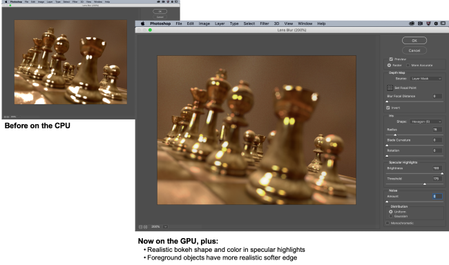 การปรับปรุงคุณภาพของเอาต์พุตและประสิทธิภาพของ Lens Blur และใส่ไว้ใน GPU ซึ่งช่วยปรับปรุงความสมจริงโดยรวมได้อย่างมาก รวมไปถึงความชัดเจนและขอบของภาพ ในกรณีที่ใช้ Lens Blur เพื่อสร้างเอฟเฟ็กต์ภาพเบลอที่ส่วนด้านหน้า พื้นหลัง หรือตรงกลางของภาพ