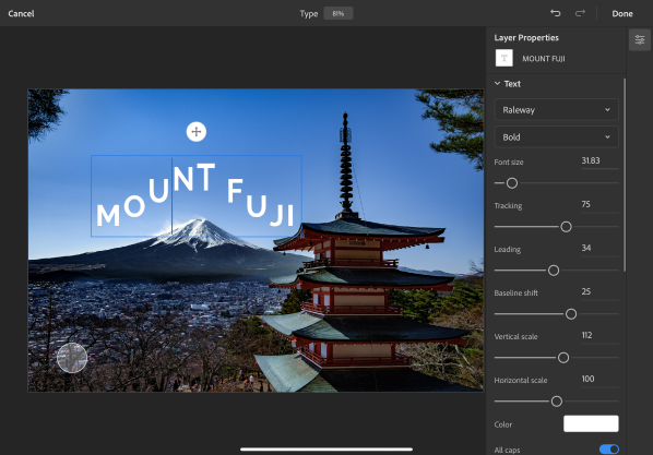 การตั้งค่าแบบอักษรในรีลีสล่าสุดนี้เป็นการนำเอาส่วนควบคุมแบบอักษรหลายๆ อย่างที่คุณใช้ใน Photoshop บนเดสก์ท็อปมาไว้ใน iPad โดยเราได้เพิ่มเติมเลเยอร์แบบอักษร คุณสมบัติของอักขระและตัวเลือกต่างๆ รวมถึงการติดตาม การจัดเรียง การปรับขนาด และการจัดรูปแบบต่างๆ เช่น ตัวพิมพ์ใหญ่ทั้งหมด/ตัวพิมพ์เล็ก, ตัวยก/ตัวห้อย ส่วนการจัดช่องไฟ (Kerning) จะเปิดตัวในรีลีสถัดไป