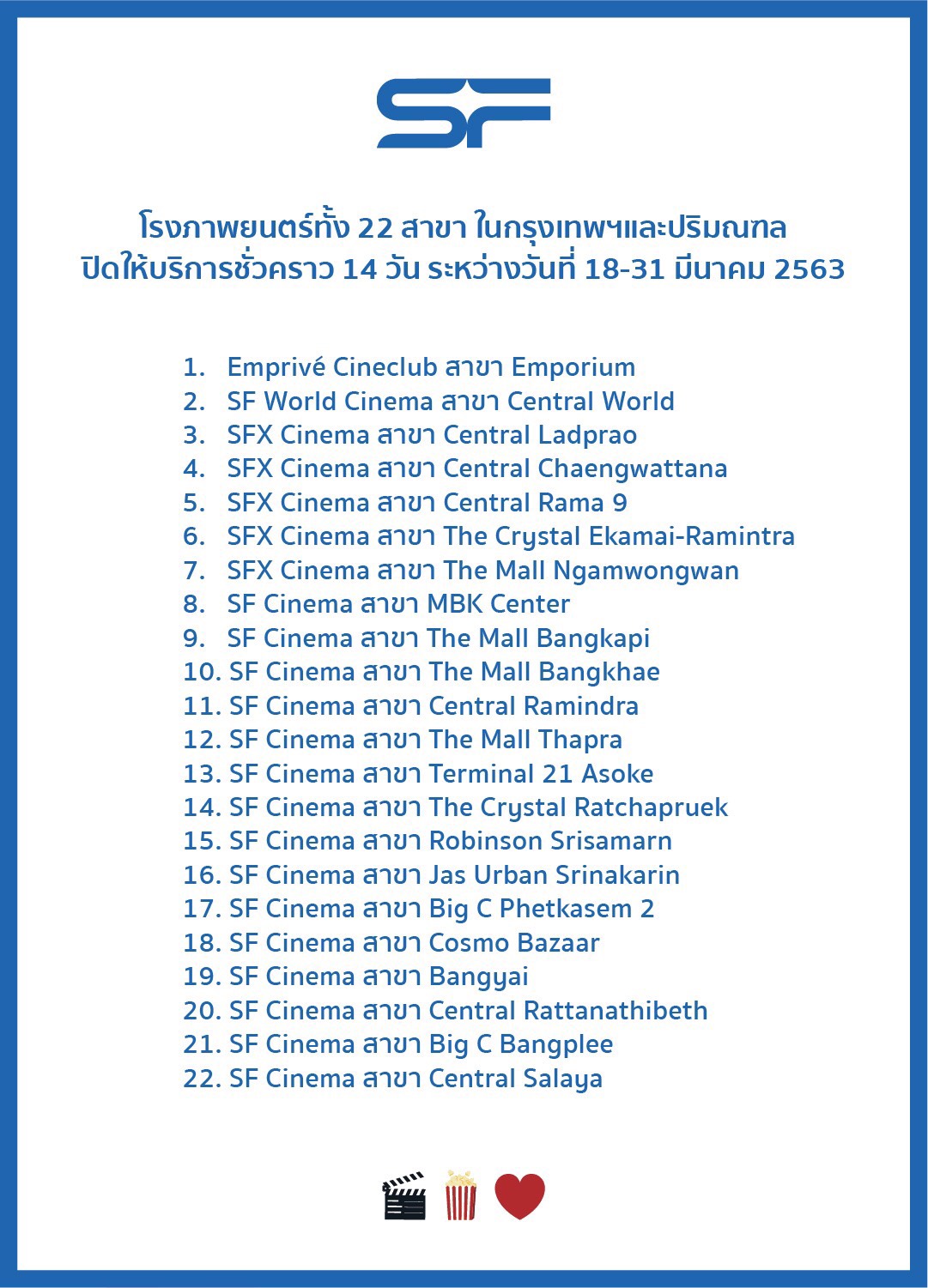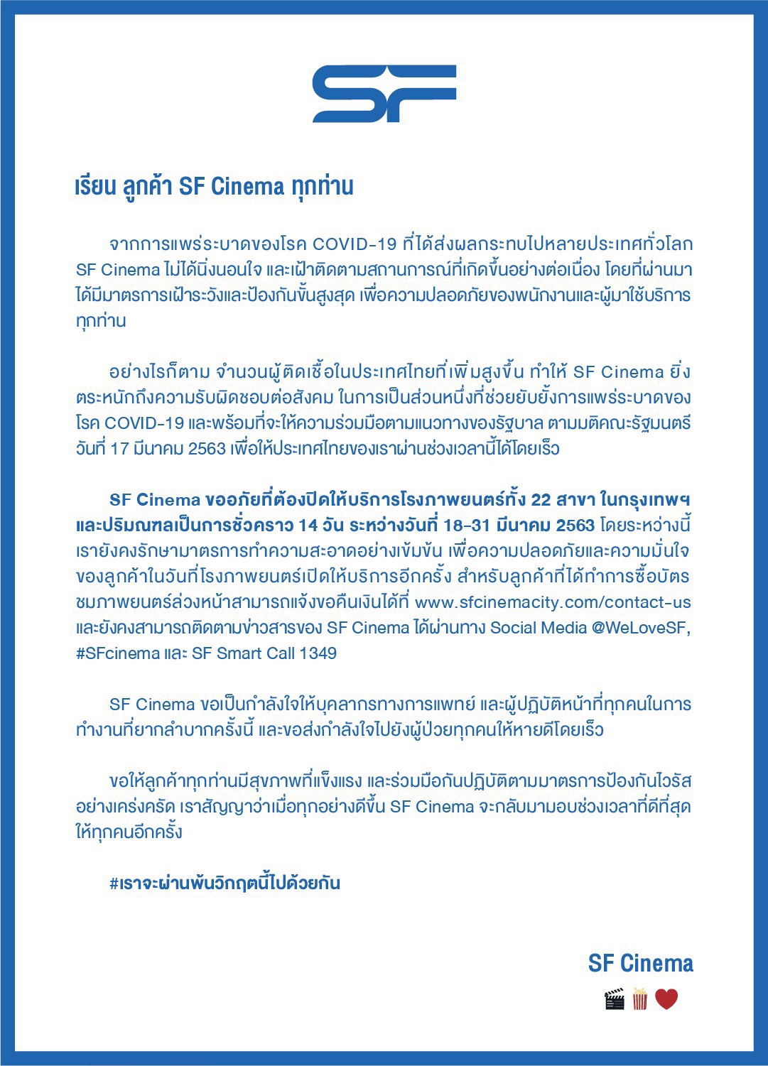 SF Cinema ขออภัยที่ต้องปิดให้บริการโรงภาพยนตร์ทั้ง 22 สาขา ในกรุงเทพฯและปริมณฑลเป็นการชั่งคราว 14 วัน ระหว่างวันที่ 18-31 มีนาคม 2563 โดยระหว่างนี้เรายังคงรักษามาตรการทำความสะอาดอย่างเข้มข้น เพื่อความปลอดภัยและความมั่นใจของลูกค้าในวันที่โรงภาพยนตร์เปิดให้บริการอีกครั้ง สำหรับลูกค้าที่ได้ทำการซื้อบัตรชมภาพยนตร์ล่วงหน้าสามารถแจ้งขอคืนเงินได้ที่ www.sfcinemacity.com/contact-us และยังคงสามารถติดตามข่าวสารของ SF Cinema ได้ผ่านทาง Social Media @WeLoveSF, #SFcinema และ SF Smart Call 1349