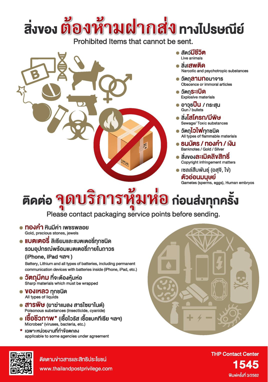 สอบถามข้อมูลเพิ่มเติมเกี่ยวกับ สิ่งของต้องห้ามฝากส่งทางไปรษณีย์ ได้ที่ THP Contact Center 1545 เว็บไซต์ www.thailandpost.co.th
