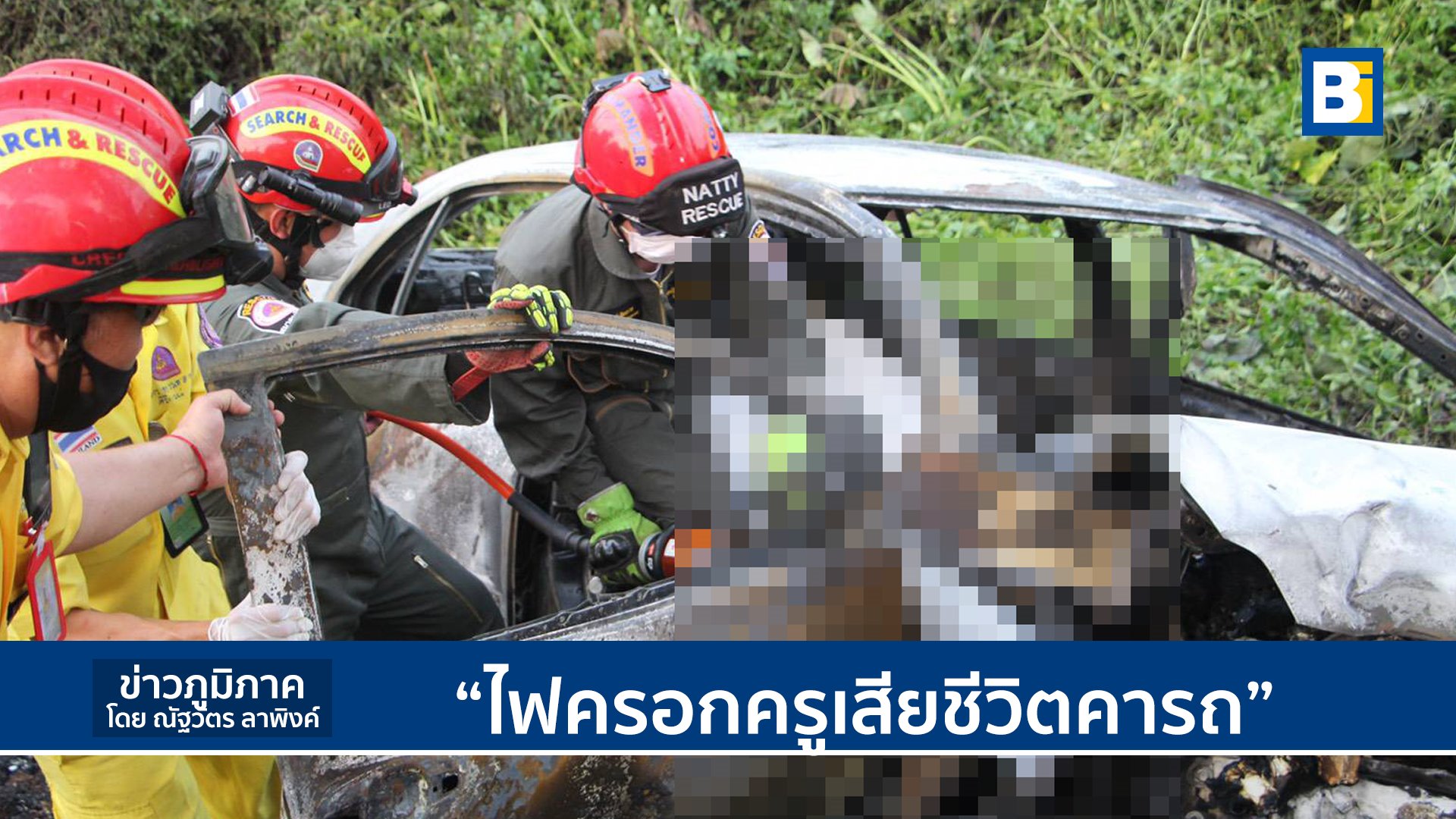 เก๋งหลุดโค้งคว่ำไฟครอกครูเสียชีวิตคารถ