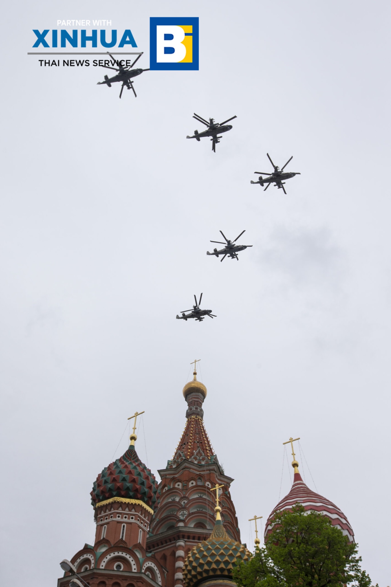 สำนักข่าวซินหัว เผยแพ่ภาพ บรรยากาศพิธีสวนสนามทางอากาศกลางน่านฟ้ากรุงมอสโก ซึ่งจัดขึ้นเพื่อเฉลิมฉลองวาระครบรอบ 75 ปี วันแห่งชัยชนะ (Victory Day) ที่กองทัพโซเวียตมีชัยเหนือกองทัพนาซีในสงครามโลกครั้งที่สอง ซึ่งตรงกับวันที่ 9 พ.ค. ของทุกปี ท่ามกลางการแพร่ระบาดของโรคติดเชื้อไวรัสโคโรนาสายพันธุ์ใหม่ (โควิด-19) ในรัสเซีย ซึ่งยังคงพบผู้ป่วยรายใหม่อย่างต่อเนื่อง