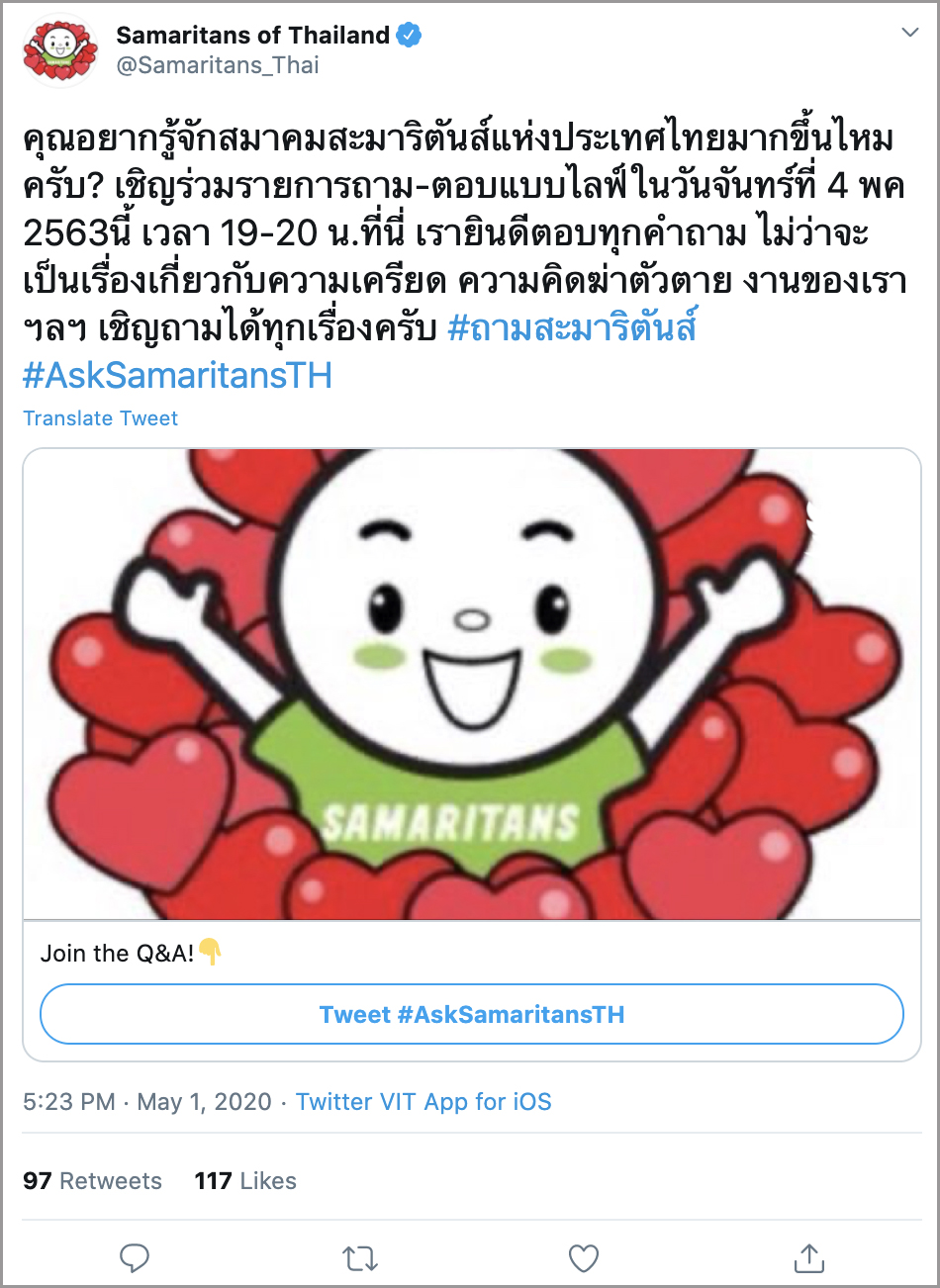 ทวิตเตอร์ร่วมเป็นพันธมิตรกับสมาคมสะมาริตันส์แห่งประเทศไทย(@Samaritans_Thai) เนื่องในวันสุขภาพจิตสากล โดยเปิดตัวบริการแจ้งเตือน #ThereIsHelp ขึ้นในประเทศไทยเพื่อป้องกันการฆ่าตัวตายและการทำร้ายตัวเอง ซึ่งล่าสุดทวิตเตอร์ได้จัดให้มีช่วงถาม-ตอบกับสมาคมสะมาริตันส์แห่งประเทศไทย เพื่อให้เกิดความเข้าใจเกี่ยวกับสุขภาพจิตในช่วงของสถานการณ์ของโควิด-19 ที่เป็นเวลาแห่งความท้าทายสำหรับทุกคนที่อาจพบกับความยากลำบาก - สถานการณ์โควิด-19