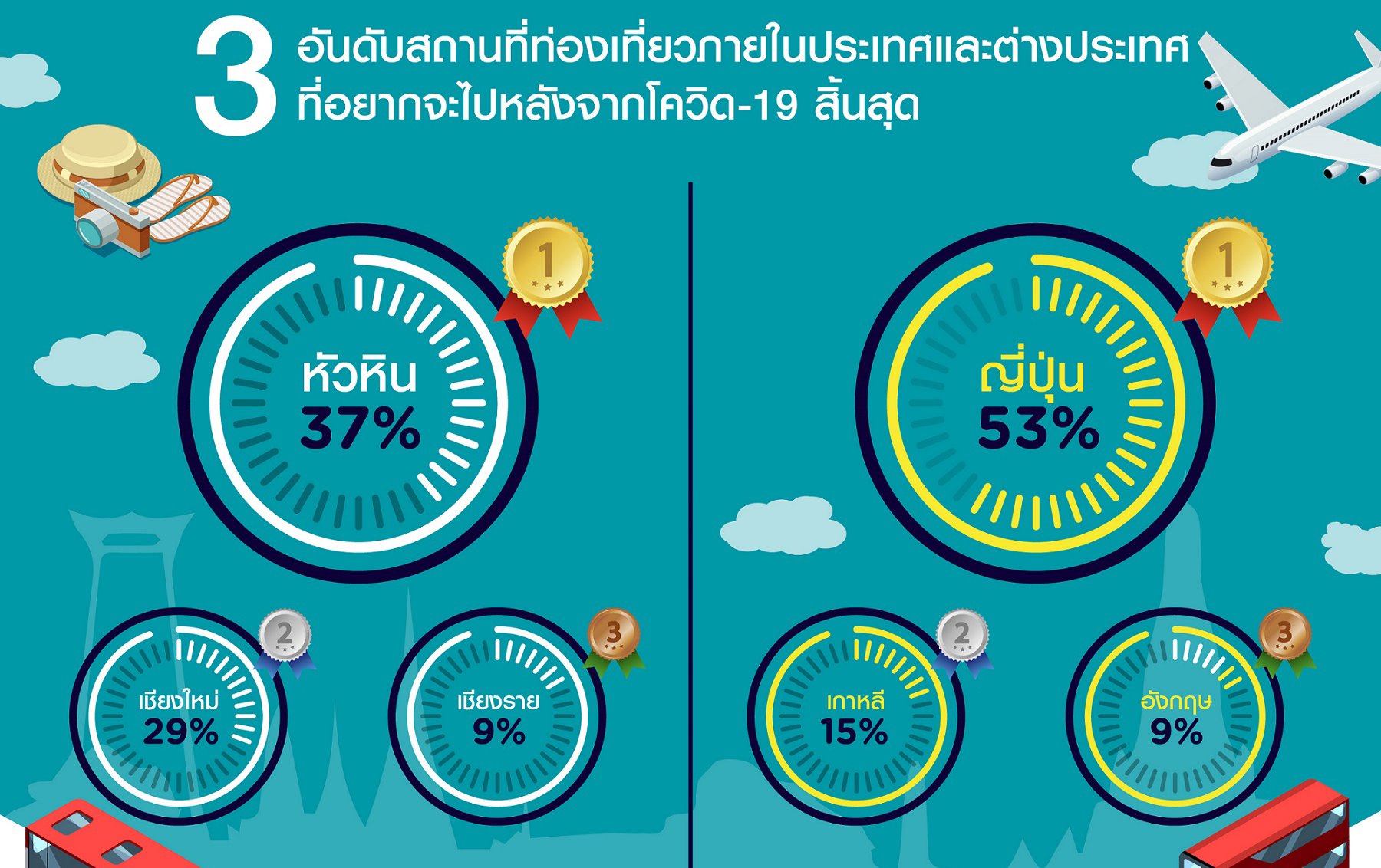 คนไทยวางแผนจะเดินทางท่องเที่ยวภายในประเทศหลังโควิด-19 ถึงร้อยละ 21 และเมื่อสอบถามว่าอยากไปท่องเที่ยวสถานที่ท่องเที่ยวใดมากที่สุด พบว่าส่วนใหญ่ยังอยากออกไปสูดอากาศบริสุทธ์และพักผ่อนตามสถานที่ท่องเที่ยวทางธรรมชาติ ไม่ว่าจะเป็นทะเลหรือภูเขา โดยอันดับหนึ่งคือ หัวหิน (ร้อยละ 37) รองลงมาคือ เชียงใหม่ (ร้อยละ 29) และ เชียงราย (ร้อยละ 9 ตามลำดับ) ในส่วนของจุดหมายปลายทางต่างประเทศ กว่าร้อยละ 53 ของผู้ตอบแบบสอบถาม ระบุว่า อยากจะเดินทางไป ประเทศญี่ปุ่น มากที่สุด ตามมาด้วย ประเทศเกาหลี ร้อยละ 15 และ ประเทศอังกฤษ ร้อยละ 9 ตามลำดับ