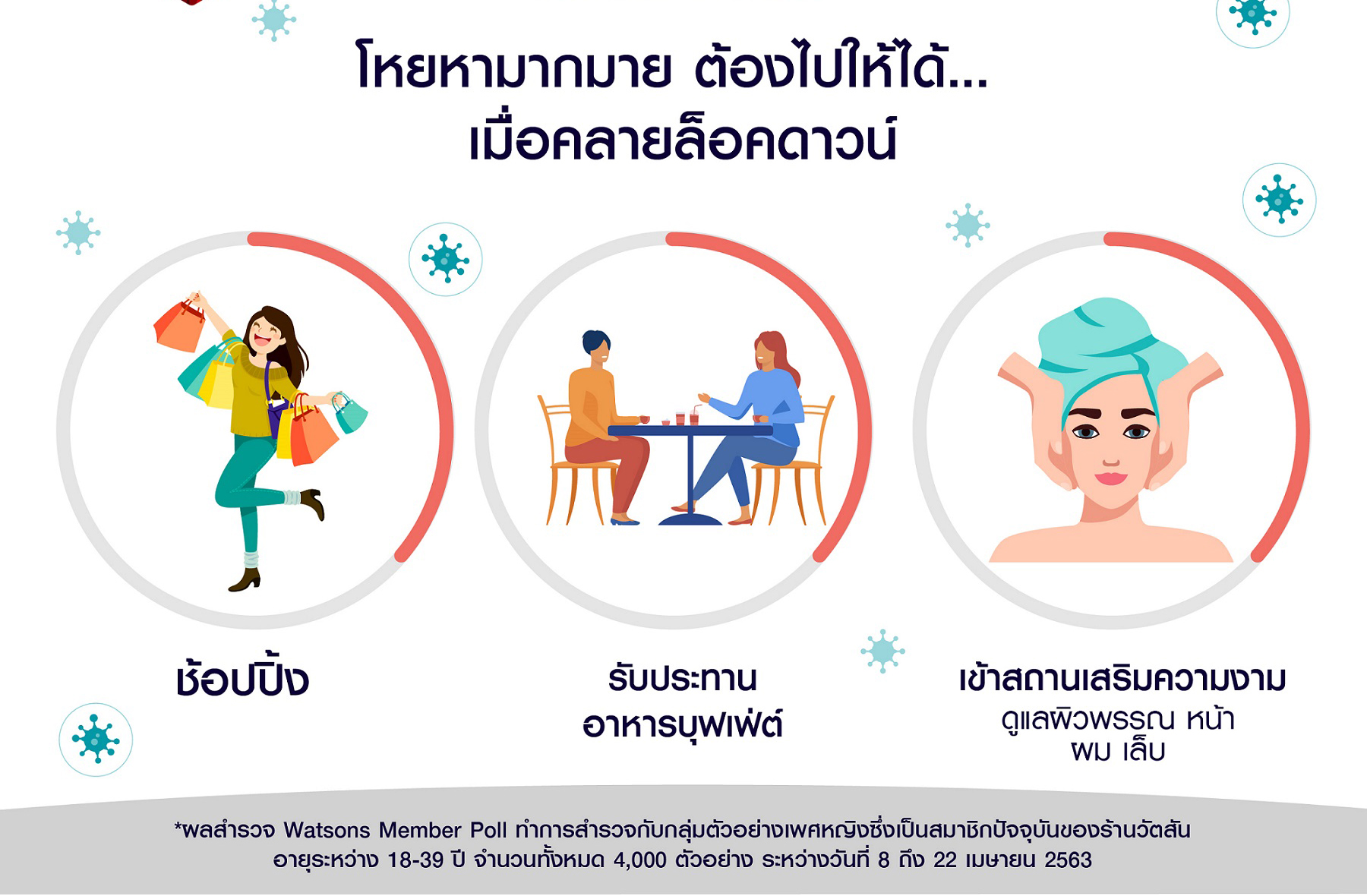 สถานการณ์การแพร่ระบาดของโรคโควิด-19 ในประเทศไทยเริ่มส่งสัญญาณที่ดีขึ้นเรื่อยๆ ประชาชนเริ่มทยอยกลับมาใช้ชีวิตได้อย่างปกติหลังจากมีมาตรการผ่อนปรนต่างๆออกมา วัตสัน ผู้นำร้านเพื่อสุขภาพและความงามอันดับหนึ่งของประเทศไทย เผยผลสำรวจ จากสมาชิกวัตสัน เกี่ยวกับกิจกรรมที่อยากจะทำมากที่สุดหลังจากสถานการณ์โควิด-19 คลี่คลาย โดยทำการสำรวจกับกลุ่มตัวอย่างเพศหญิงซึ่งเป็นสมาชิกปัจจุบันของร้านวัตสัน อายุระหว่าง 18-39 ปี จำนวนทั้งหมด 4,000 ตัวอย่าง ระหว่างวันที่ 8 ถึง 22 เมษายน 2563 โดยมีประเด็นที่น่าสนใจดังต่อไปนี้