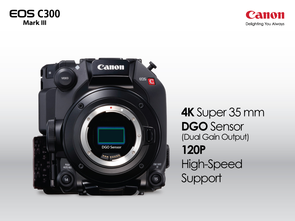 ด้วยเซ็นเซอร์ Dual Gain Output (DGO) และระบบ CMOS ขนาดซุปเปอร์ 35 มม. ความละเอียดระดับ 4K ที่ได้รับการพัฒนาขึ้นใหม่ ทำให้ EOS C300 Mark III สามารถถ่ายวิดีโอความละเอียดระดับ 4K/ 60p ด้วยช่วงไดนามิกที่สูงมากและสัญญาณรบกวนต่ำในโหมด DGO ได้ กล้องถ่ายภาพยนตร์ EOS C300 Mark III มาพร้อมกับระบบการประมวลผลวิดีโอแบบ DIGIC DV 7 จึงรองรับการบันทึกอัตราเฟรมสูงความละเอียดระดับ 4K/ 120p และยังมีเทคโนโลยี Dual Pixel CMOS AF ให้ความแม่นยำในการโฟกัสสูง ซึ่งจำเป็นสำหรับการบันทึกด้วยความละเอียดระดับ 4