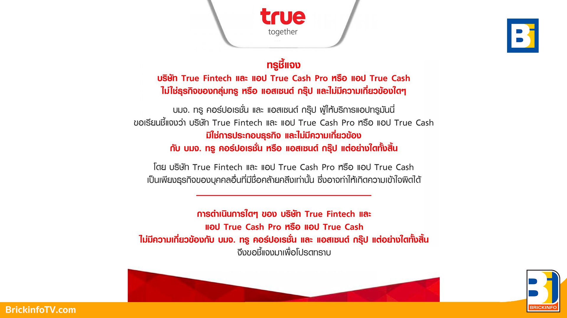 ทรู ย้ำ บจก.ทรู ฟินเทค แอป TRUE CASH PRO และแอป TRUE CASH ไม่ใช่ธุรกิจของกลุ่มทรูและไม่มีความเกี่ยวข้องใดๆ