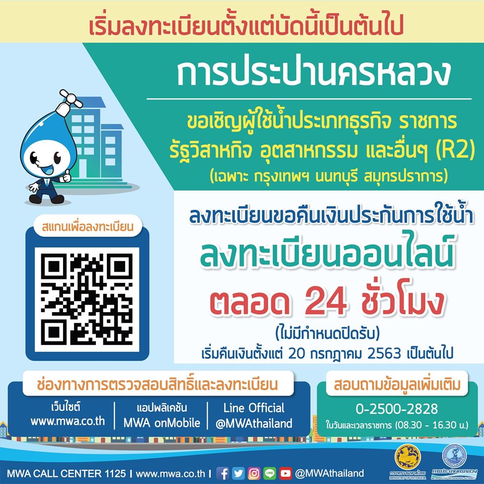 โดย กปน. จะคืนเงินประกันการใช้น้ำให้กับผู้ใช้น้ำประเภทธุรกิจ ราชการ รัฐวิสาหกิจ อุตสาหกรรมและอื่น ๆ (R2) ซึ่งผู้ใช้น้ำที่ขอเงินประกันคืน จะต้องมีชื่อตรงกับผู้วางเงินประกันการใช้น้ำ โดยเริ่มเปิดให้ตรวจสอบสิทธิ์และลงทะเบียนได้ตั้งแต่บัดนี้เป็นต้นไป โดยไม่จำกัดระยะเวลา ผ่านช่องทาง 1. www.mwa.co.th 2. App MWA onMobile 3.Line OA : @MWAthailand