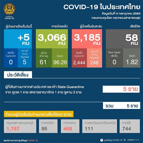 ไทยพบผู้ติดเชื้อโควิด 19 รายใหม่ 5 ราย ยอด ติดเชื้อสะสม 3,185 ราย