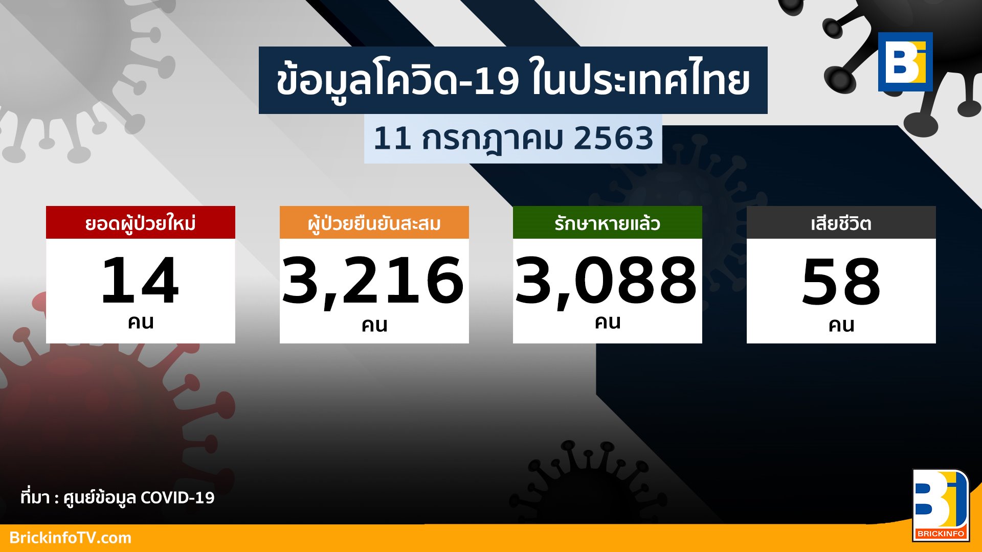ในวันนี้ประเทศไทย พบผู้ติดเชื้อรายใหม่วันนี้จำนวน 14 ราย เป็นผู้ที่เดินทางมาจากต่างประเทศ ส่งผลให้มียอดผู้ป่วยสะสม 3,216 รายราย ด้านผู้ป่วยที่ยังคงรักษาตัวอยู่ในโรงพยาบาลขณะนี้มีจำนวน 70 ราย รักษาหายเพิ่มจำนวน 1 ราย รวมจำนวนรักษาหาย 3,088 ราย และไม่มีผู้เสียชีวิตเพิ่ม ทำให้ยอดผู้เสียชีวิตสะสมอยู่ที่ 58 ราย