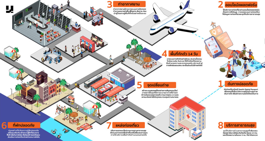 2. จัดการตรวจสอบโรคตั้งแต่ต้นทางและปลายทาง รวมถึงสร้างระบบการเดินทางแบบปลอดเชื้อ ตลอดห่วงโซ่อุปทานของการท่องเที่ยว