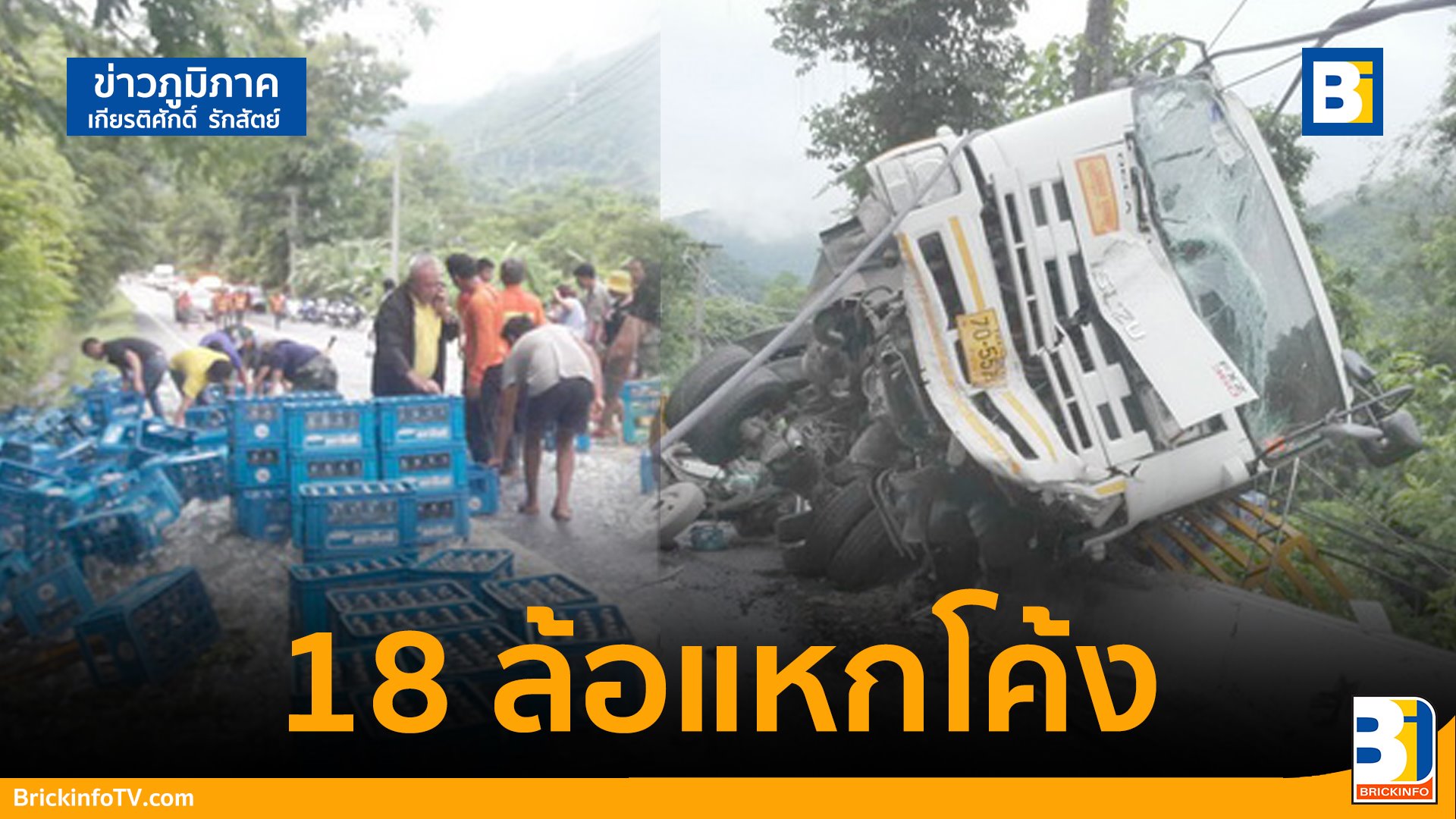 รถพ่วง 18 ล้อแหกโค้ง พลิกคว่ำชนเสาไฟฟ้าหัก 4 ต้น