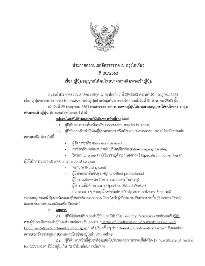 (4 ส.ค. 63) สถานเอกอัครราชทูต ณ กรุงโตเกียว ออกประกาศ ผ่านช่องทางโซเซียลมีเดียของสถานทูตไทย เรื่อง ประเทศญี่ปุ่นอนุญาตให้คนไทยบางกลุ่มเดินทางเข้าญี่ปุ่นได้แล้ว โดยในข้อความระบุว่า เมื่อวันที่ 29 ก.ค. 63 กระทรวงการต่างประเทศญี่ปุ่นได้ประกาศอนุญาตให้คนไทยบางกลุ่มเดินทางเข้าญี่ปุ่น มีรายละเอียดโดยสรุป ดังนี้
