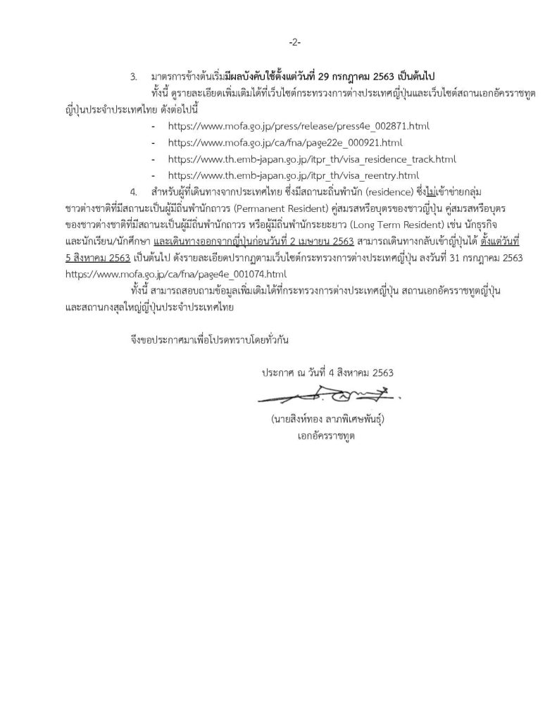 4. สำหรับผู้ที่เดินทางจากประเทศไทย ซึ่งมีสถานะถิ่นพำนัก (residence) ซึ่งไม่เข้าข่ายกลุ่มชาวต่างชาติที่มีสถานะเป็นผู้มีถิ่นพำนักถาวร (Permanent Resident) คู่สมรสหรือบุตรของชาวญี่ปุ่น คู่สมรสหรือบุตรของชาวต่างชาติที่มีสถานะเป็นผู้มีถิ่นพำนักถาวร หรือผู้มีถิ่นพำนักระยะยาว (Long Term Resident) เช่น นักธุรกิจ และนักเรียน/นักศึกษา และเดินทางออกจากญี่ปุ่นก่อนวันที่ 2 เมษายน 2563 สามารถเดินทางกลับเข้าญี่ปุ่นได้ ตั้งแต่วันที่ 5 สิงหาคม 2563 เป็นต้นไป ดังรายละเอียดปรากฏตามเว็บไซต์กระทรวงการต่างประเทศญี่ปุ่น ลงวันที่ 31 กรกฎาคม 2563 https://www.mofa.go.jp/ca/fna/page4e_001074.html