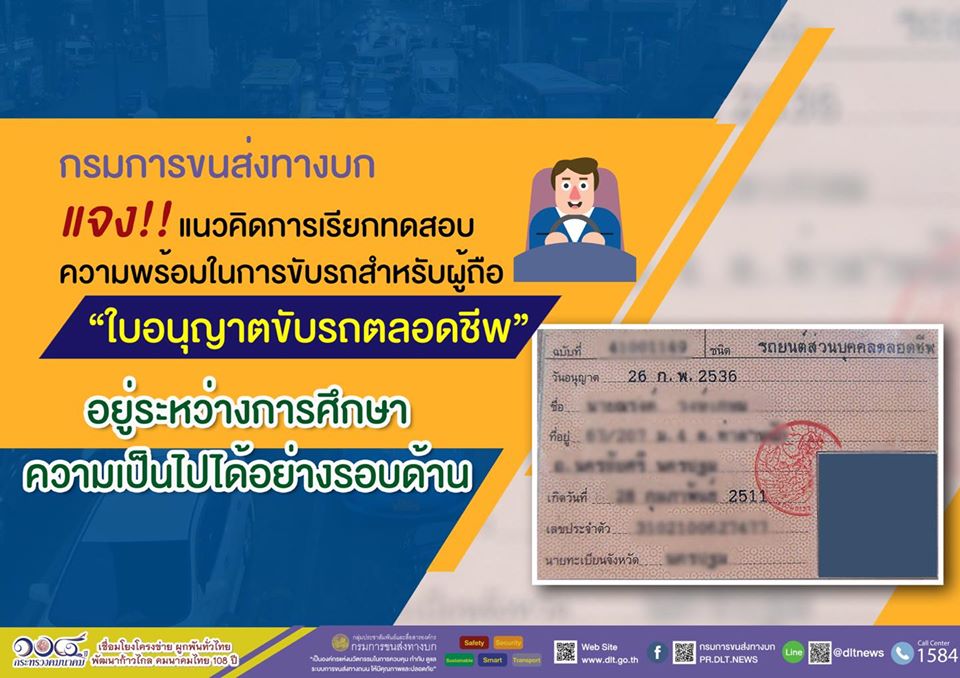 กรมการขนส่งทางบก แจงแล้ว แนวคิดการเรียกทดสอบความพร้อมในการขับรถสำหรับผู้ถือใบอนุญาตขับรถตลอดชีพ อยู่ระหว่างการศึกษาความเป็นไปได้ อย่างรอบด้าน