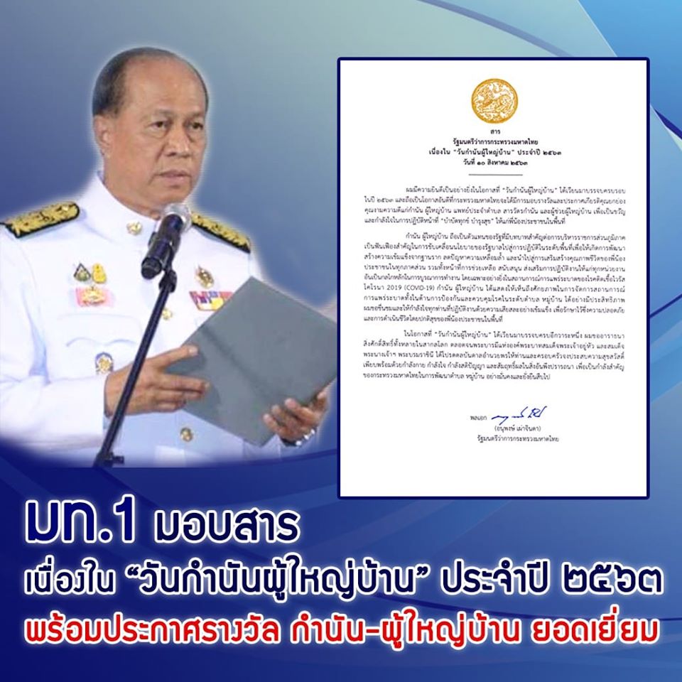 พลเอก อนุพงษ์ เผ่าจินดา รัฐมนตรีว่าการกระทรวงมหาดไทย ได้มอบสารเนื่องในโอกาส “วันกำนันผู้ใหญ่บ้าน” ประจำปี 2563 โดยมีใจความสำคัญตอนหนึ่งว่า “กำนัน ผู้ใหญ่บ้าน ถือเป็นตัวแทนของรัฐที่มีบทบาทสำคัญต่อการบริหารราชการส่วนภูมิภาค เป็นฟันเฟืองสำคัญในการขับเคลื่อนนโยบายของรัฐบาลไปสู่การปฏิบัติในระดับพื้นที่ เพื่อให้เกิดการพัฒนา สร้างความเข้มแข็งจากฐานราก ลดปัญหาความเหลื่อมล้ำ และนำไปสู่การเสริมสร้างคุณภาพชีวิตของพี่น้องประชาชนในทุกภาคส่วน รวมทั้งหน้าที่การช่วยเหลือ สนับสนุน ส่งเสริมการปฏิบัติงานให้แก่ทุกหน่วยงาน อันเป็นกลไกหลักในการบูรณาการทำงาน