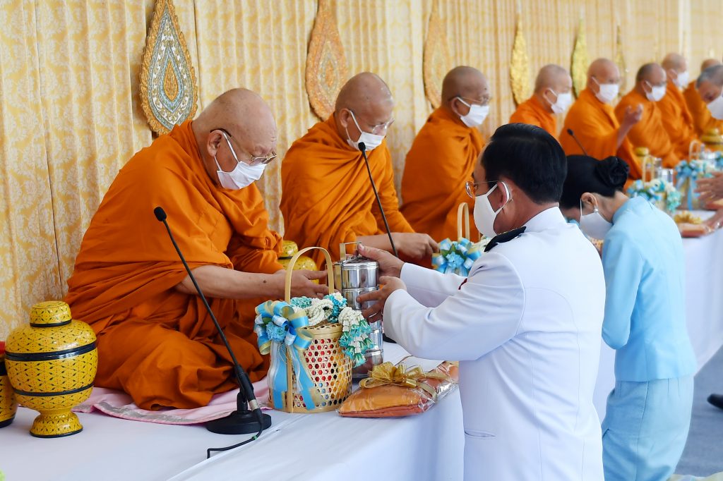 จากนั้น นายกรัฐมนตรีและภริยา ร่วมพิธีทำบุญตักบาตรพระสงฆ์ จำนวน 89 รูป เป็นอันเสร็จพิธี