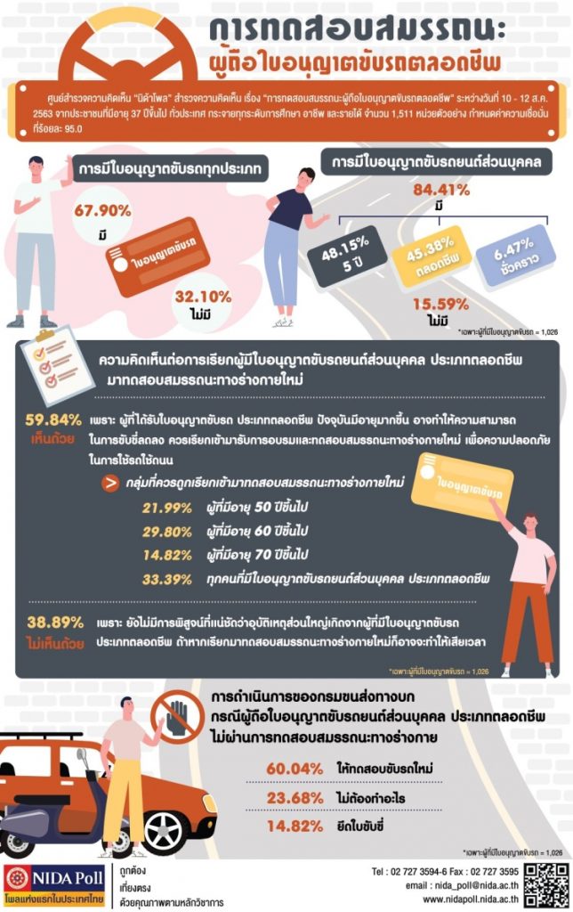ศูนย์สำรวจความคิดเห็น “นิด้าโพล” สถาบันบัณฑิตพัฒนบริหารศาสตร์ (นิด้า) เปิดเผยผลสำรวจของประชาชน เรื่อง “การทดสอบสมรรถนะผู้ถือใบอนุญาตขับรถตลอดชีพ” เกี่ยวกับการทดสอบสมรรถนะผู้ถือใบอนุญาตขับรถตลอดชีพ