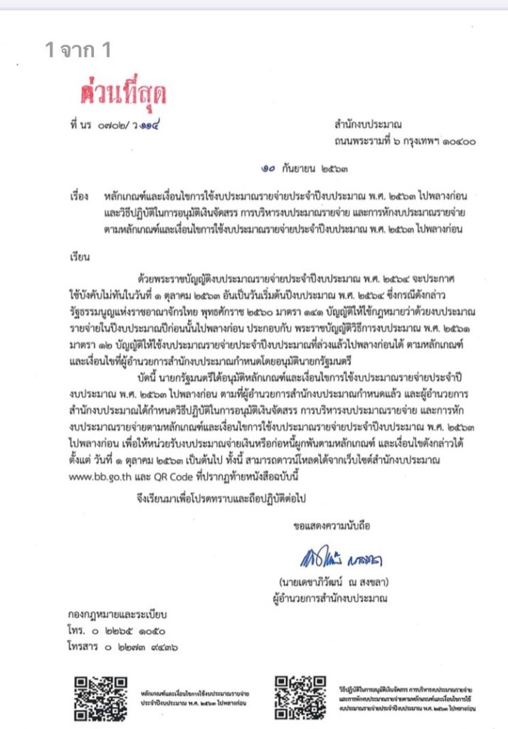 เพื่อให้หน่วยรับงบประมาณจ่ายเงินหรือก่อหนี้ผูกพันตามหลักเกณฑ์ และเงื่อนไขดังกล่าวได้ ตั้งแต่วันที่ 1 ต.ค.2563 เป็นต้นไป ทั้งนี้ สามารถดาวน์โหลดได้จากเว็บไซต์สำนักงบประมาณ www.bb.go.th จึงเรียนมาเพื่อโปรดทราบและถือปฏิบัติต่อไป ขอแสดงความนับถือ