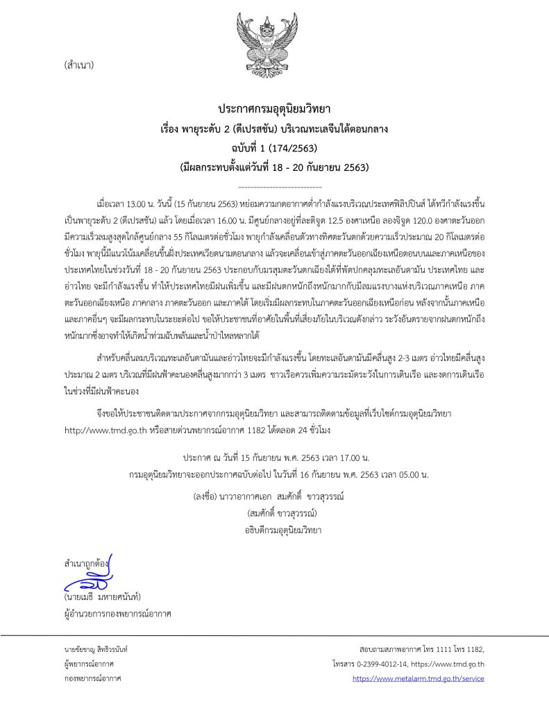 ประกาศ ณ วันที่ 15 กันยายน พ.ศ. 2563 เวลา 17.00 น. กรมอุตุนิยมวิทยาจะออกประกาศฉบับต่อไป ในวันที่ 16 กันยายน พ.ศ. 2563 เวลา 05.00 น. ลงชื่อ) นาวาอากาศเอก สมศักดิ์ ขาวสุวรรณ์อธิบดีกรมอุตุนิยมวิทยา