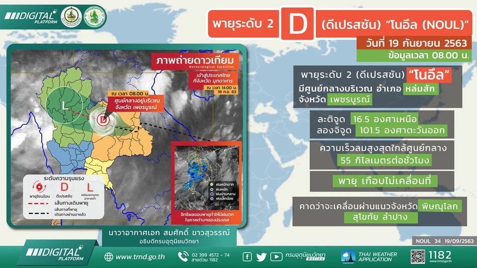 (19 ก.ย. 63) กรมอุตุนิยมวิทยา ประกาศฉบับที่ 14 พายุระดับ 3 (โซนร้อน) “โนอึล” ได้อ่อนกำลังลงเป็นพายุระดับ 2 (ดีเปรสชัน) “โนอึล”บริเวณจังหวัดขอนแก่น หรือที่ละติจูด 16.0 องศาเหนือ ลองจิจูด 102.0 องศาตะวันออก มีความเร็วลมสูงสุดใกล้ศูนย์กลางประมาณ 55 กิโลเมตรต่อชั่วโมง พายุกำลังเคลื่อนตัวทางทิศตะวันตกด้วยความเร็วประมาณ 25 กิโลเมตรต่อชั่วโมง คาดว่าจะอ่อนกำลังเป็นหย่อมความกดอากาศต่ำและสลายตัวในบริเวณจังหวัดสุโขทัยในวันนี้ (19 ก.ย. 2563)