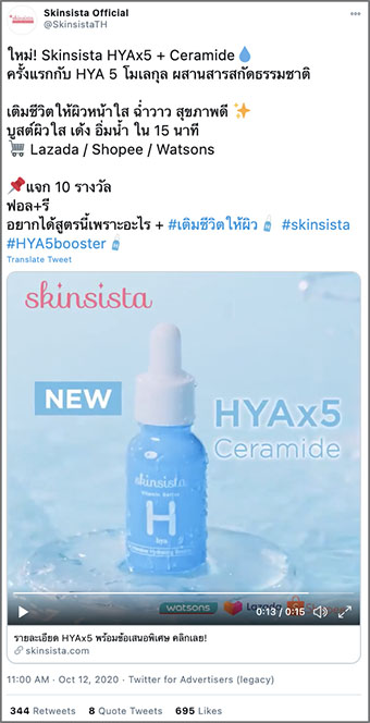 แม้ว่าชื่อเสียงของแบรนด์จะมีความสำคัญ แต่ผู้ใช้งานทวิตเตอร์ก็ยังคงมองหาผลิตภัณฑ์ใหม่ๆ เสมอ แบรนด์ความงามสัญชาติไทยจึงได้เริ่มพยายามลองทำอะไรใหม่ๆ มากขึ้น มีการติดอาวุธด้านความรู้ใหม่ๆ ในเรื่องของเทรนด์ความนิยมของผู้บริโภคในประเทศ และเริ่มมีการใช้งานทวิตเตอร์เพิ่มมากขึ้นเพื่อเข้าถึงกลุ่มผู้บริโภค แบรนด์ไทยที่กำลังเติบโตอย่าง Skinsista ได้มีการเปิดตัวผลิตภัณฑ์ใหม่ “HYAx5 Ceramide booster” บนทวิตเตอร์ด้วยคลิปวิดีโอที่ทำแคมเปญเน้นถึงจุดขายของผลิตภัณฑ์ที่แตกต่าง สร้างการรับรู้และสร้างบทสนทนา โดย คุณณัฐพร พงษ์ชาญชวลิต กรรมการผู้จัดการ Skin Laboratories กล่าวถึงการเปิดตัวผลิตภัณฑ์นี้ว่า “เราอยากจะสร้างกระแสให้กับการเปิดตัวผลิตภัณฑ์ตัวใหม่ล่าสุด ซึ่งแคมเปญบนทวิตเตอร์ทำได้ตามที่เราต้องการ ทั้งนี้คอนเซปต์ของวิดีโอยังได้รับความสนใจเป็นวงกว้างจากกลุ่มเป้าหมายที่สนใจด้านความงามบนทวิตเตอร์ โดยเฉพาะเอ็นเกจเม้นต์ที่ดีในช่วงของการเปิดตัวอย่างมากมาย”