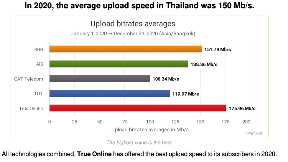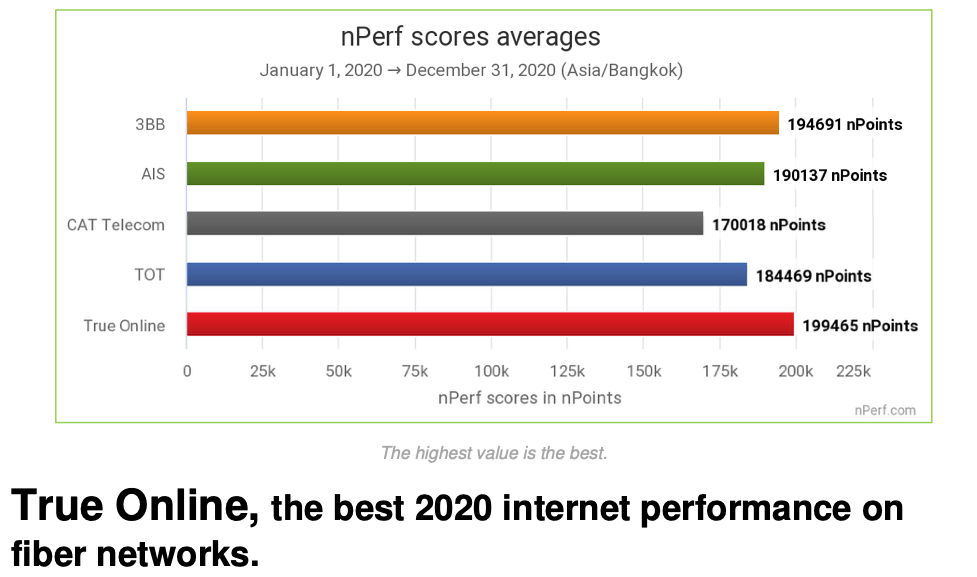 ทั้งนี้ nPerf เป็นแอปพลิเคชันที่ใช้ทดสอบคุณภาพอินเทอร์เน็ตระดับโลกจากประเทศฝรั่งเศส ซึ่งให้บริการมาตั้งแต่ปี 2003 โดยได้ทดสอบความเร็วอินเทอร์เน็ตบ้านของประเทศไทยประจำปี 2563 (Fixed Internet Performances) ซึ่งผลการสำรวจได้รวบรวมจากผู้ใช้งานแอป nPerf ทั้งหมดในช่วงระหว่างวันที่ 1 มกราคม ถึง 31 ธันวาคม 2563 เก็บผลการทดสอบทั้งหมด จำนวน 12,130,702 ครั้ง พบว่า ทรูออนไลน์ สามารถทำคะแนนรวมได้สูงสุด 174,771 คะแนน เมื่อเปรียบเทียบกับผู้ให้บริการบรอดแบนด์อินเทอร์เน็ต (ISP) รายอื่น มีคะแนนสูงสุดทั้งความเร็วในการดาวน์โหลด 281.40 Mb/s และความเร็วในการอัปโหลด 175.96 Mb/s นอกจากนี้ยังได้ทดสอบความเร็วไฟเบอร์ ตลอดปี 2563 (FTTH/Fiber to the home) โดยทดสอบทั้งสิ้น 5,177,367 ครั้ง ทรูออนไลน์ได้คะแนนสูงสุด 199,465 คะแนน มีความเร็วสูงสุดในการดาวน์โหลดที่ 504.66 Mb/s และความเร็วอัปโหลดสูงสุดที่ 317.88 Mb/s ซึ่งทรูออนไลน์เอาชนะผู้ให้บริการบรอดแบนด์อินเทอร์เน็ต (ISP) รายอื่น ทั้ง 2 รางวัล ได้แก่ “อินเทอร์เน็ตบรอดแบรนด์ที่ดีที่สุดในไทยประจำปี 2563” และ “รางวัลไฟเบอร์ดีที่สุดในไทยประจำปี 2563”