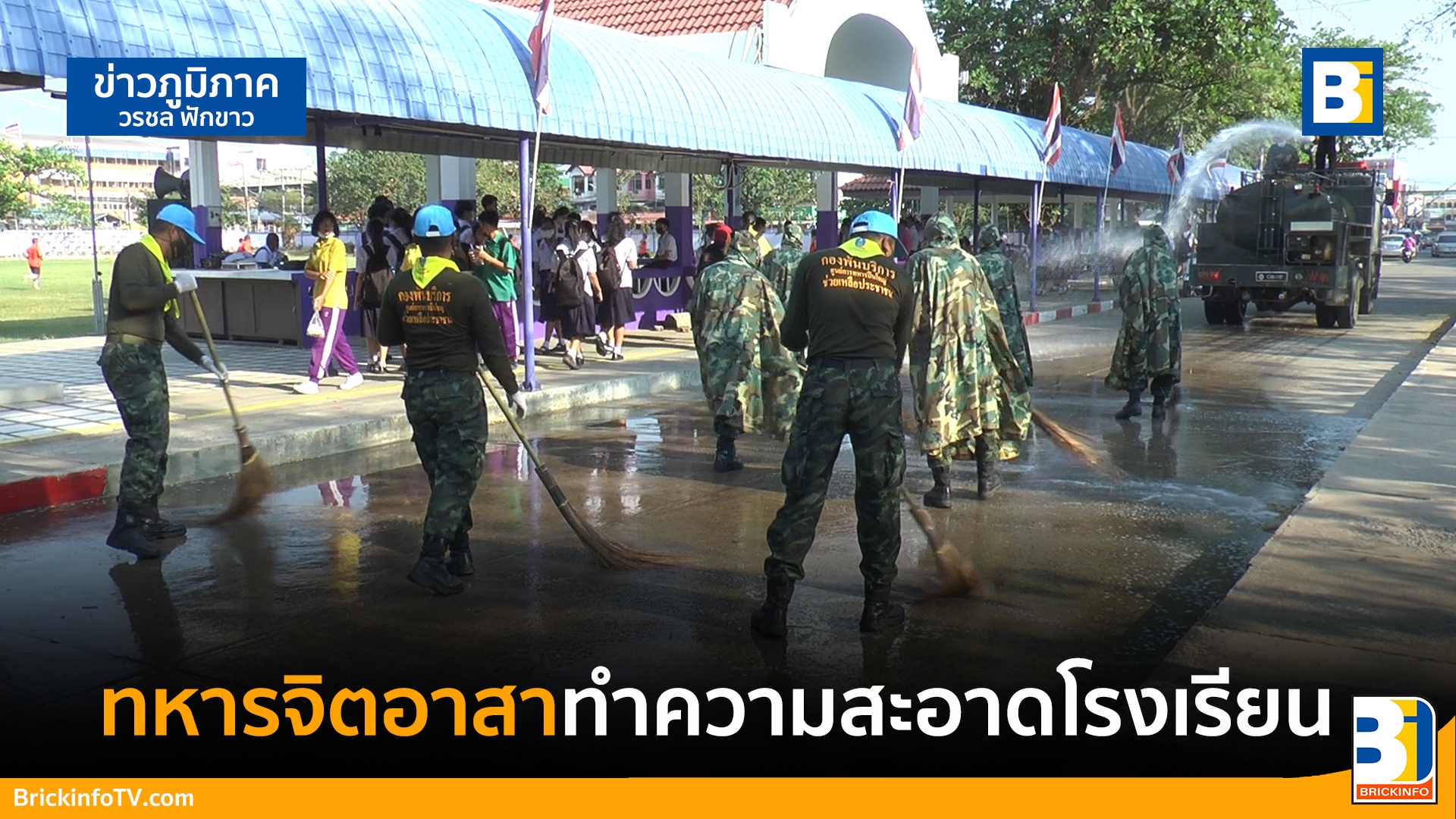 ศูนย์การทหารปืนใหญ่จัดชุดทหารจิตอาสาพระราชทานทำความสะอาดโรงเรียนพร้อมฉีดพ้นยาฆ่าเชื้อป้องกันโควิด-19